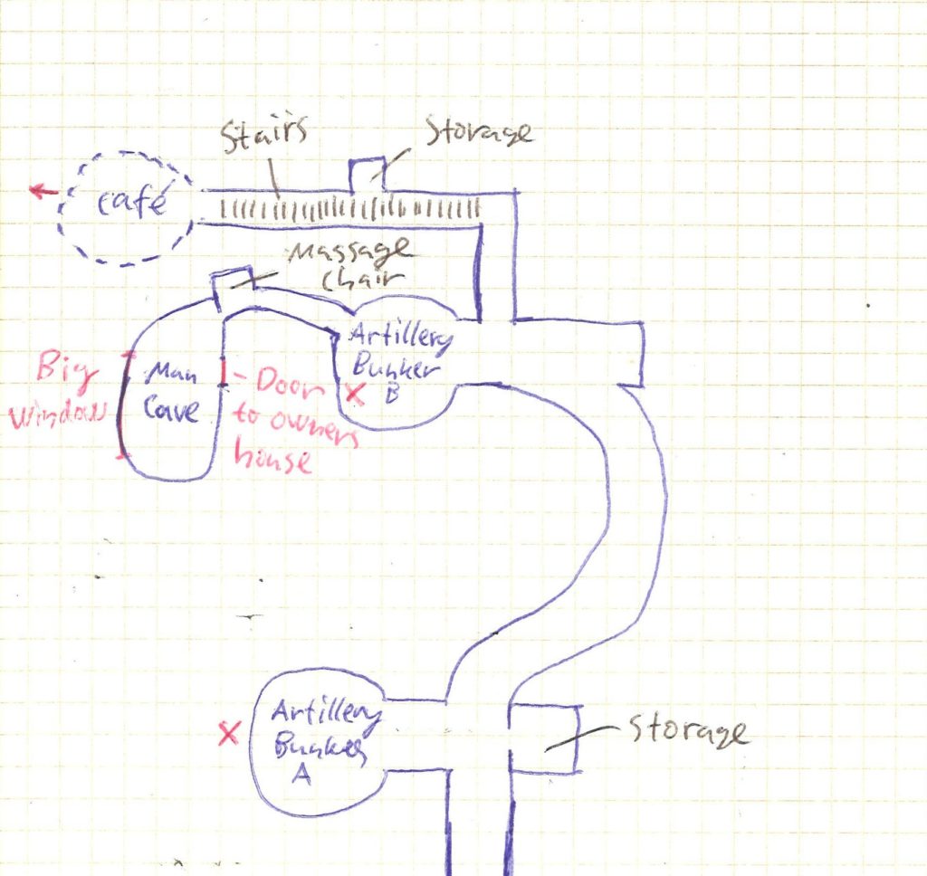 I had previously entered via the fallen tree bunker. This time David showed us that it’s possible to reach Bunker 127 from the trail and get in from there. It didn’t take us long before we reached the blocked off opening just by the trail. From there we took the wide tunnel that passes by Bunker 128 and ends at a fence. We managed to get past the fence and just beyond it we found a small storage room. Just around the corner from that we came to a big round bunker with large, boarded-up windows, and instructional posters showing angles and distances painted onto the concrete wall. This had clearly been an artillery emplacement which I call Artillery Bunker A. Having discovered this new, unexplored area I knew I would have to update my map so I got out my notebook and started sketching. Here is the new section of the map: