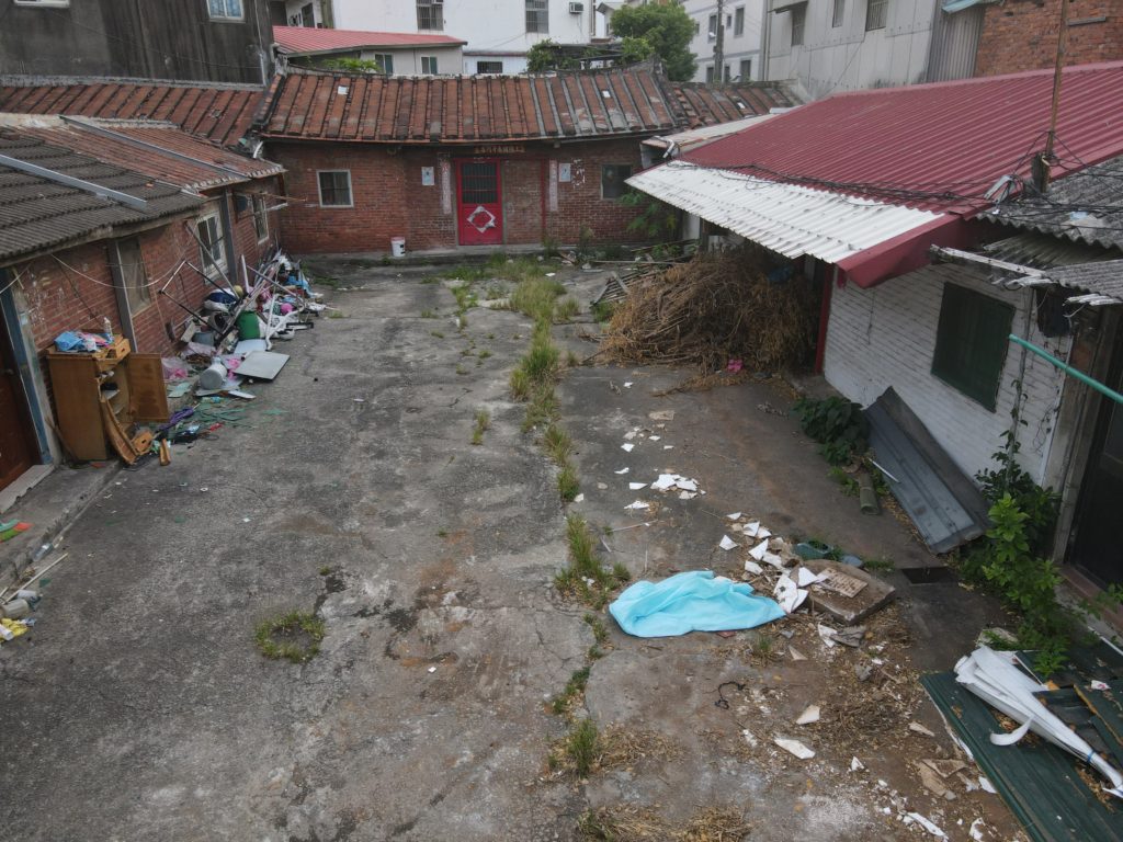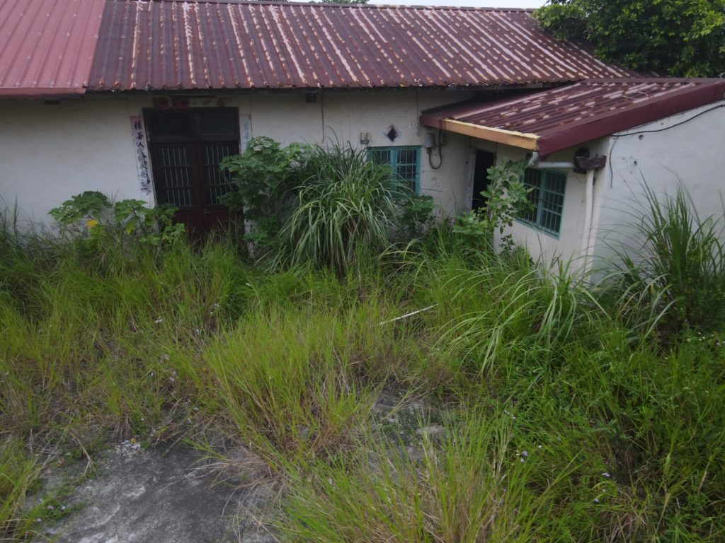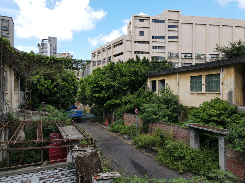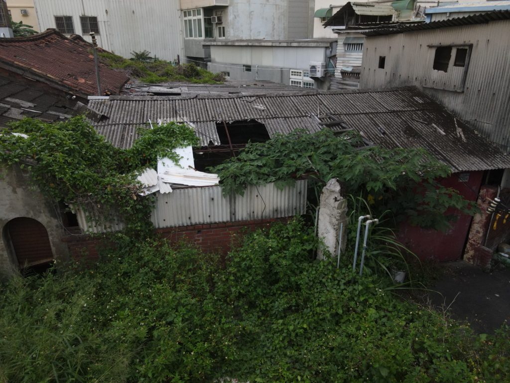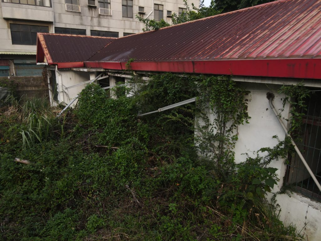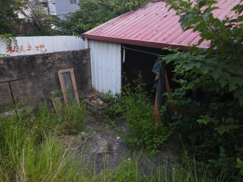Since starting my new job I’ve been trying to find a good route to go to work in the morning. In the hopes of finding a way to bypass some of the rush hour traffic jam, I tried a bunch of small alleys and backstreets. While exploring some of these alleys I noticed a building with dark empty windows, surrounded by the type of corrugated metal fence that I’ve seen around some other ruins. Since I’ve made this particular alley part of my daily commute I’ve been able to confirm that the place is indeed abandoned. I don’t know anything about this place except that it looks very much like a traditional Taiwanese house with three buildings in a horse shoe shape around a courtyard. There are also a number of other buildings attached to it, I guess you could call it a compound. What’s interesting is that it’s right next to one of the busiest streets in the city yet it seems to have been left alone until recently when the fence was installed.