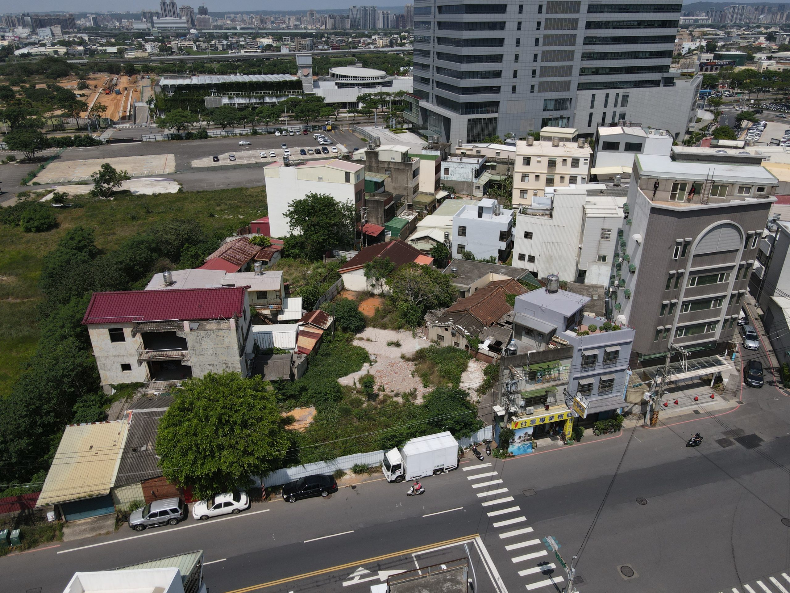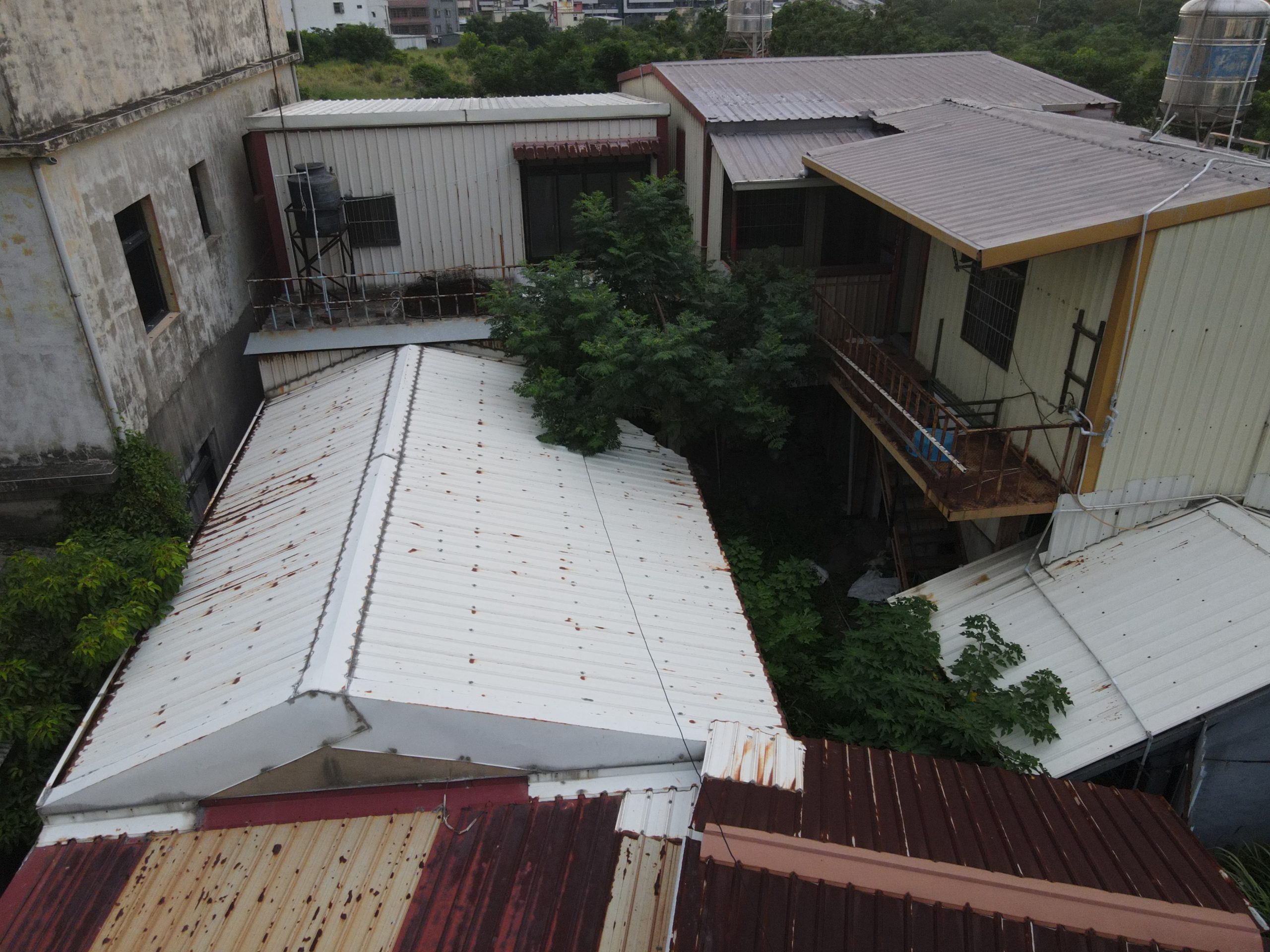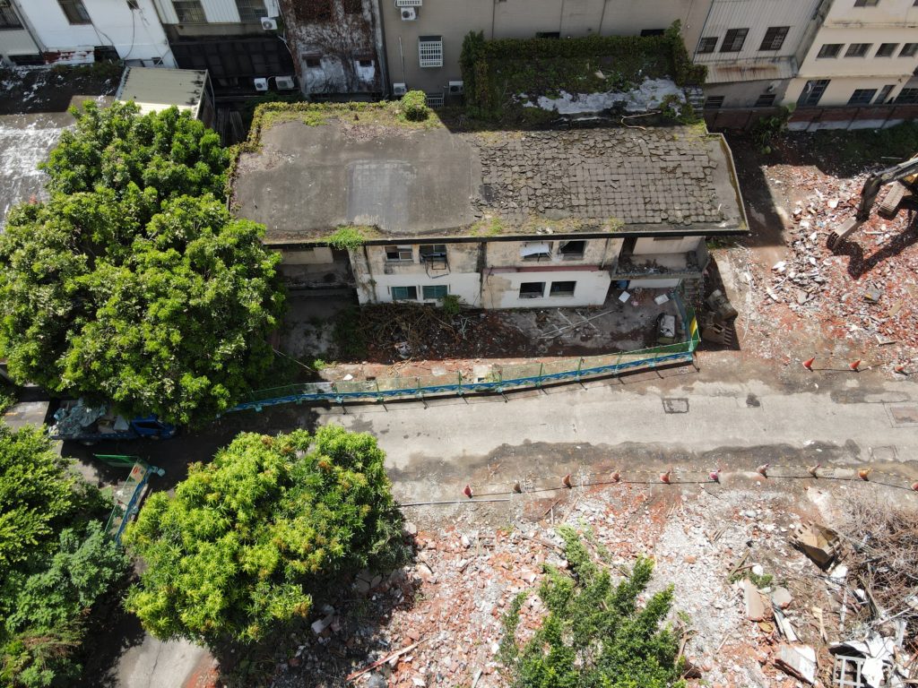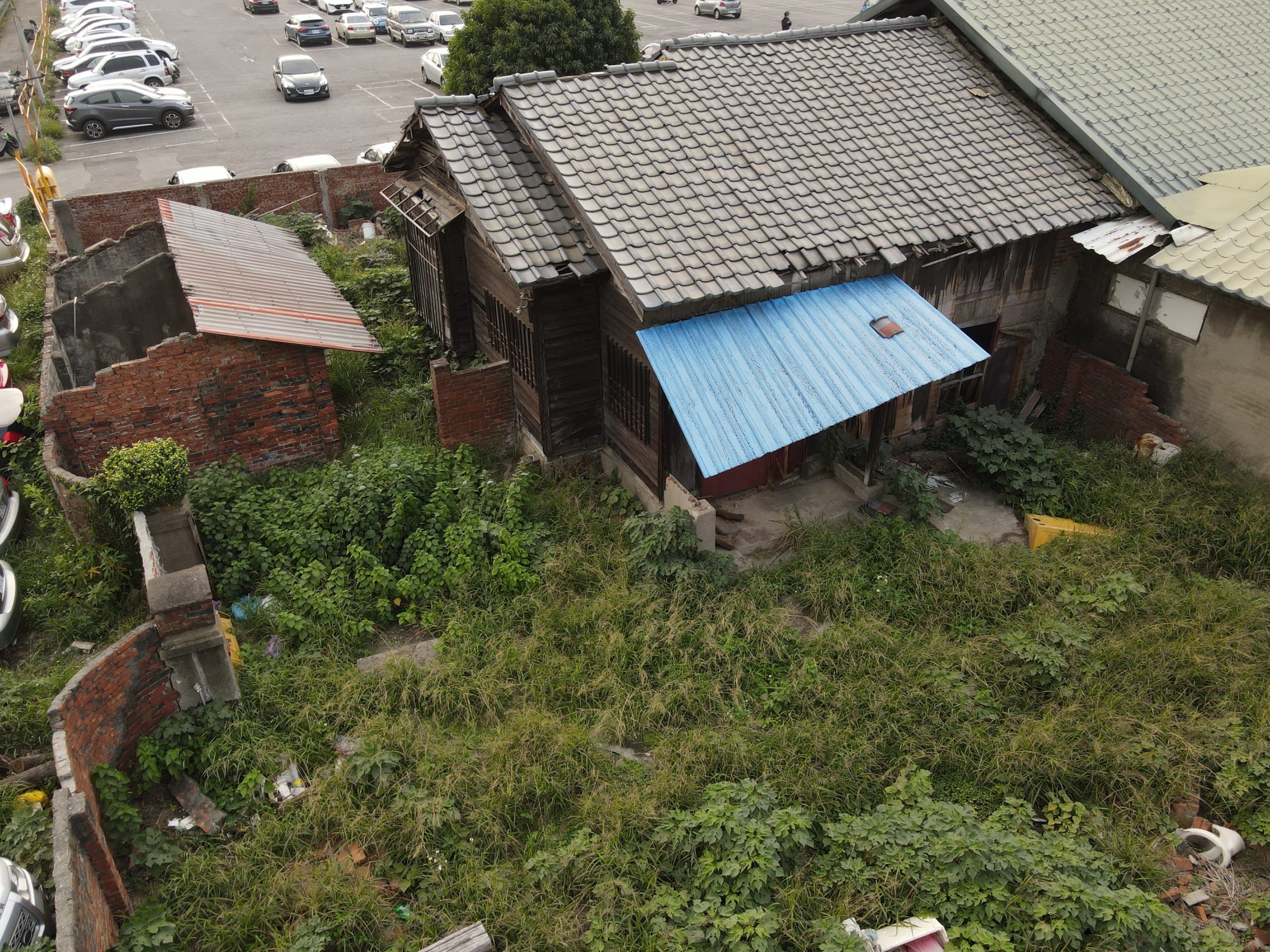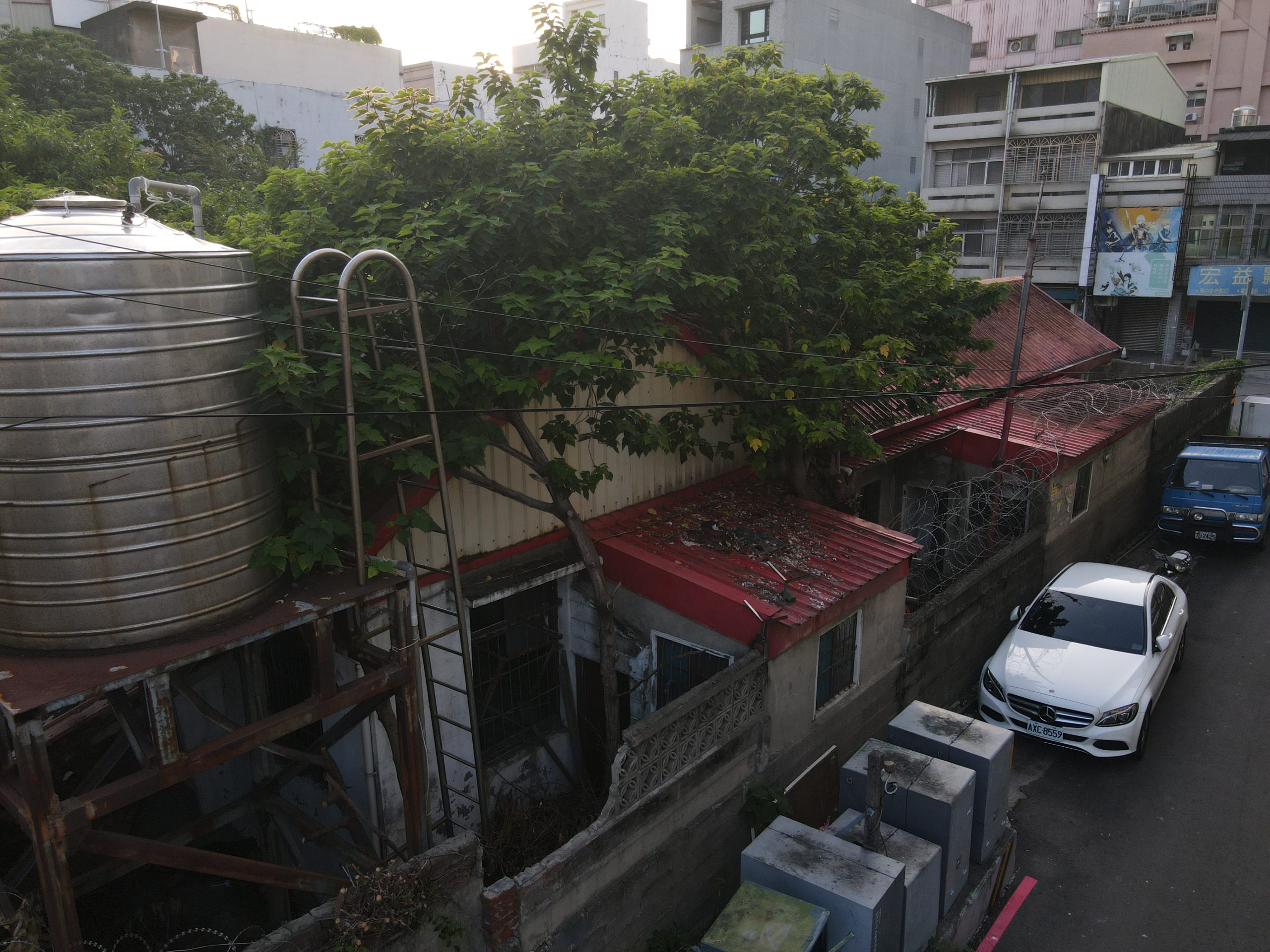 Since starting my new job I’ve been trying to find a good route to go to work in the morning. In the hopes of finding a way to bypass some of the rush hour traffic jam, I tried a bunch of small alleys and backstreets. While exploring some of these alleys I noticed a building with dark empty windows, surrounded by the type of corrugated metal fence that I’ve seen around some other ruins. Since I’ve made this particular alley part of my daily commute I’ve been able to confirm that the place is indeed abandoned. I don’t know anything about this place except that it looks very much like a traditional Taiwanese house with three buildings in a horse shoe shape around a courtyard. There are also a number of other buildings attached to it, I guess you could call it a compound. What’s interesting is that it’s right next to one of the busiest streets in the city yet it seems to have been left alone until recently when the fence was installed.