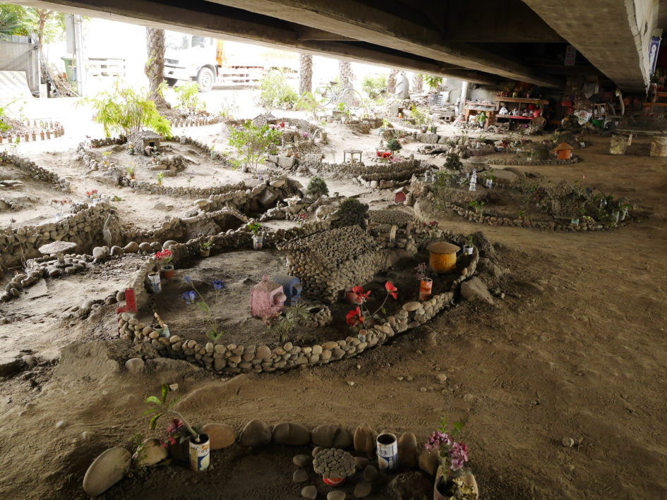 The main span of the bridge is high enough to park cars under, but there are a couple of areas off to the sides where the bridge structure is so low that they become unusable (at least in the eyes of the government). One man has turned these swathes of would be wasteland into his own little world, full of houses, lakes and trees. He has built it all using a combination of stones (that I guess he found in the area), recycled cans and bottles, steel wire, and old discarded toys. At first it might not look like much, just a few childish looking houses covered in the dust from passing trucks. As you explore further you realize there’s a lot more to it: there are the little touches like flowers growing in old soup cans, the bright splashes of color in the otherwise gray landscape, and strategically placed toy figures that bring life to this little world, but above all it’s the scale. An area roughly 50 meters long and 5 meters wide is completely covered in little dioramas (I think that’s the best word for it), and all of them are unique, with lots creative touches. I think instead of trying to describe this place, it’s better I show you some photos: