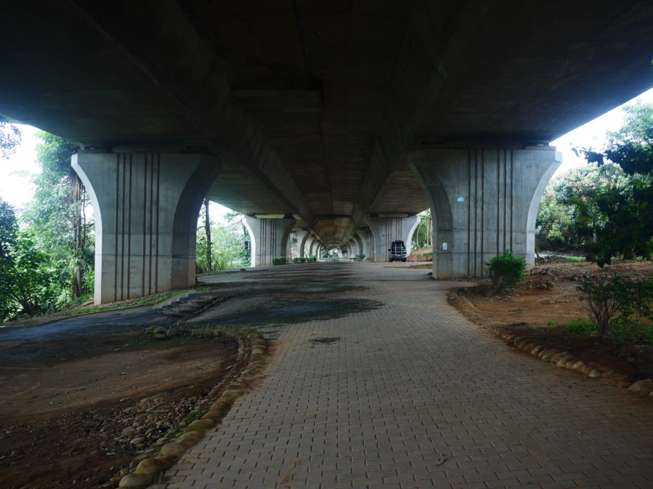 Like the name suggests, this is a hiking trail, or rather a strolling trail, because to be honest it’s far too flat for any actual hiking. It’s roughly two kilometers from end to end (though they are working to extend it) and except for a few short sections, the entire trail lies under National Highway No. 3. You’d think with such a description there would be nothing but asphalt and concrete, but there is a surprising amount of greenery down there, with bushes and even full size trees. This makes for a special kind of contrast where it feels like you’re simultaneously out in nature and and in a long tunnel . I think at this point I’d better show some pictures so you can see what I mean.