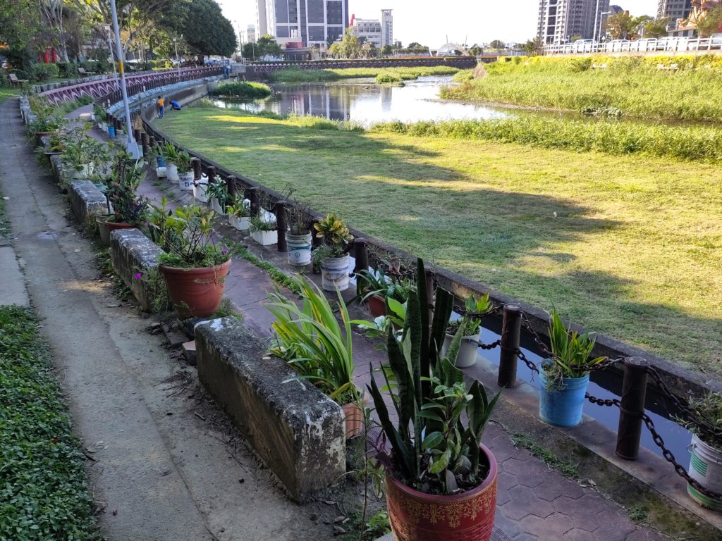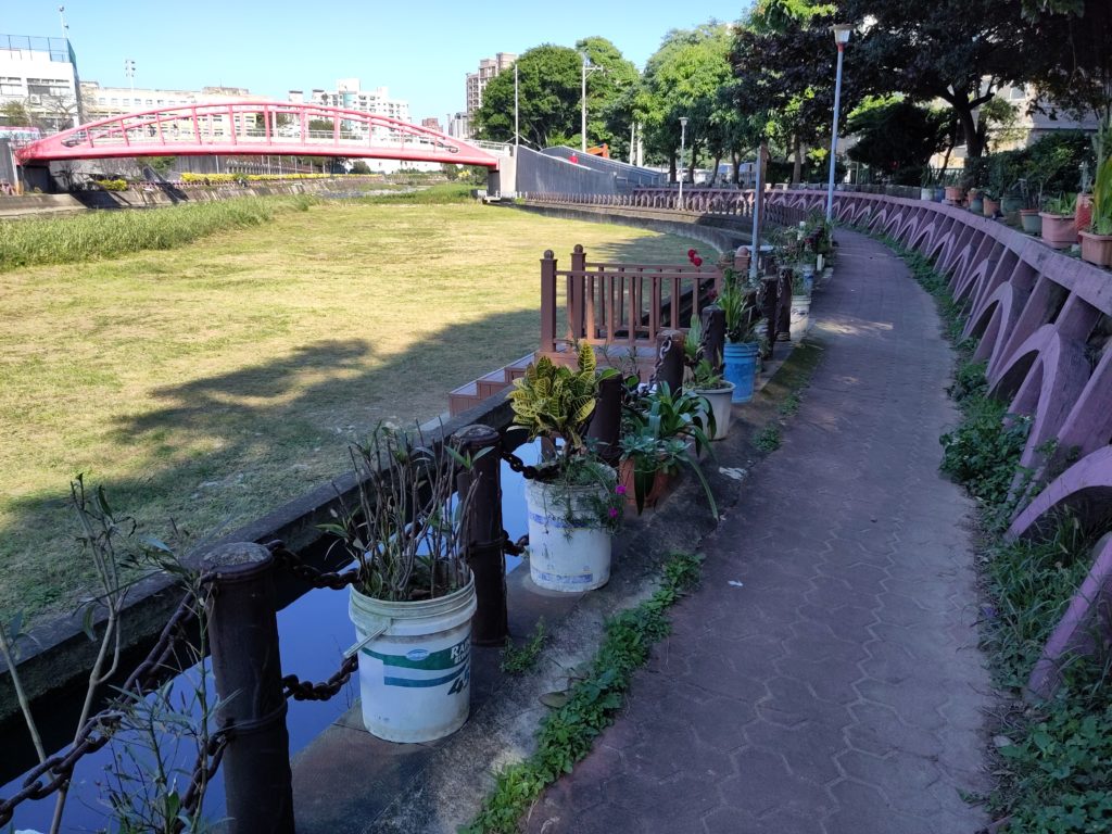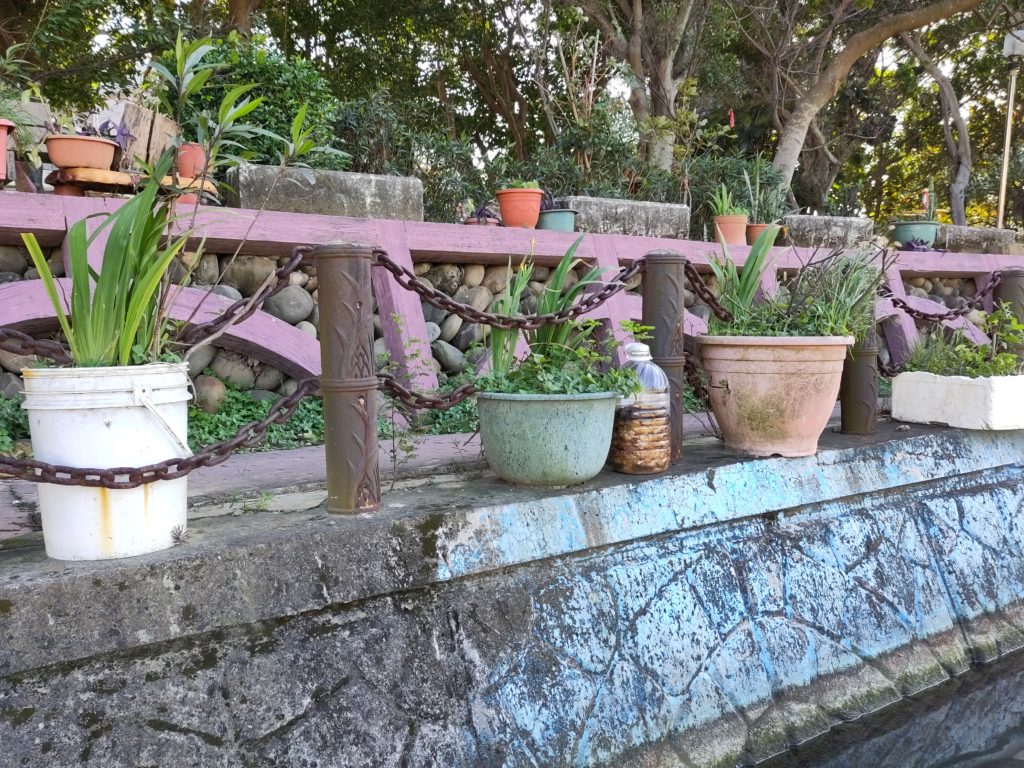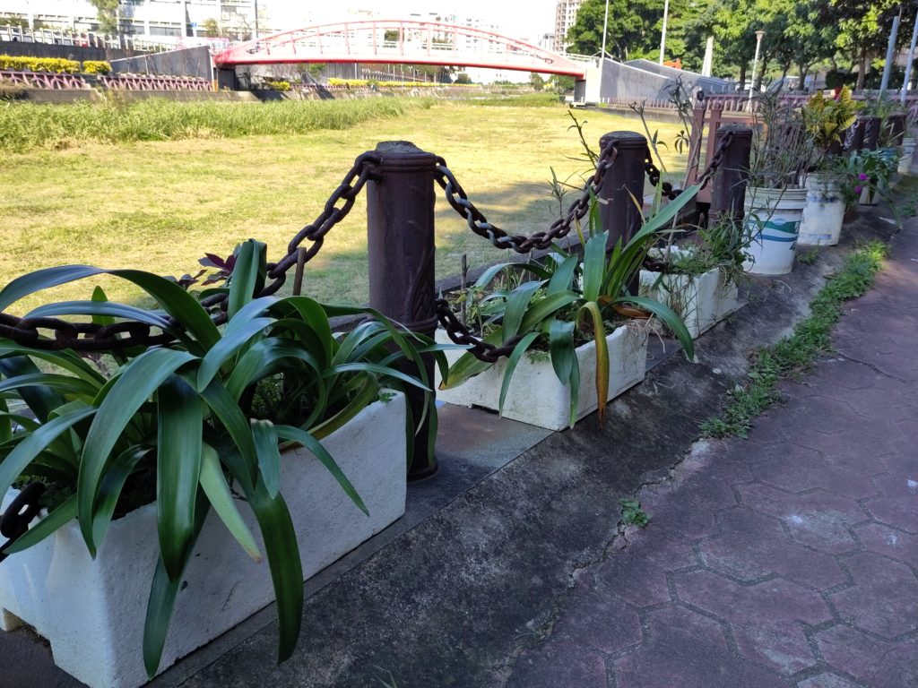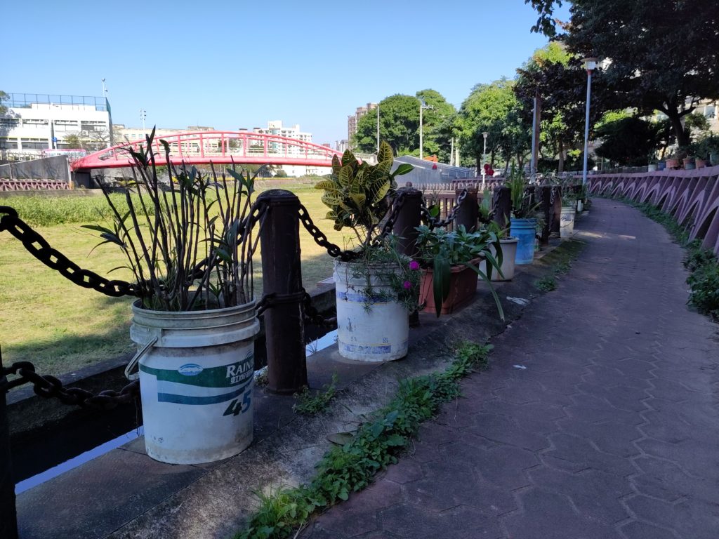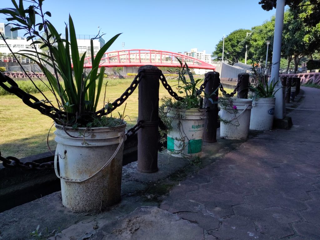 After passing under a bright red bridge I came to what can best be described as a lawn. Right there in the middle of the river is a plot of land with grass growing on it. I had planned to turn back after the bridge but this was odd enough to pique my interest and I decided to keep exploring. It was lucky I did because a short distance down the path from the red bridge is the reason this park ended up on my growing list of strange places in Taiwan: a seemingly random collection of pot plants. There’s every kind of pot you can imagine, from discarded old paint buckets to Styrofoam boxes to glazed ceramic ones, and they’re lined up along both sides of the path. The plants in them are just as varied as the pots, from snake plants to roses and everything in-between. There wouldn’t be anything strange about it in someone’s backyard but here in a public park it feels extremely out of place.