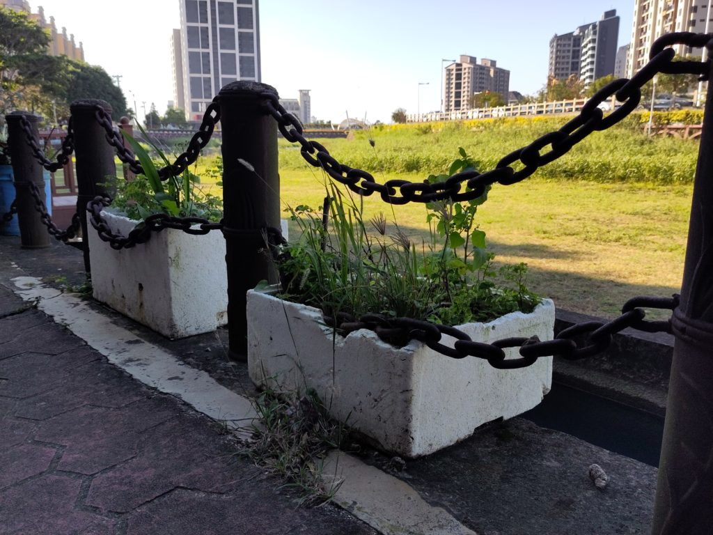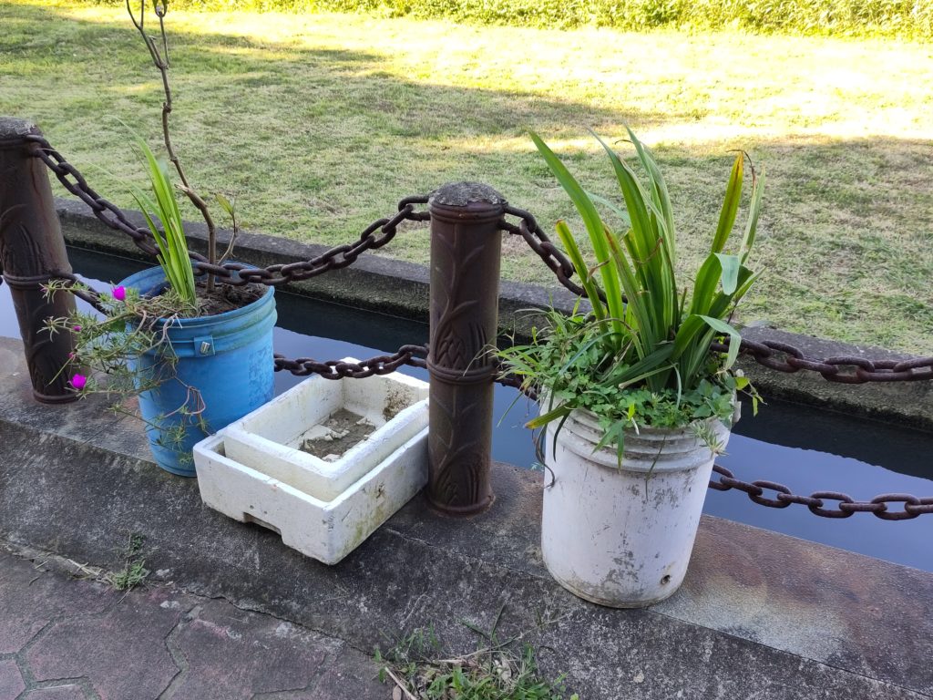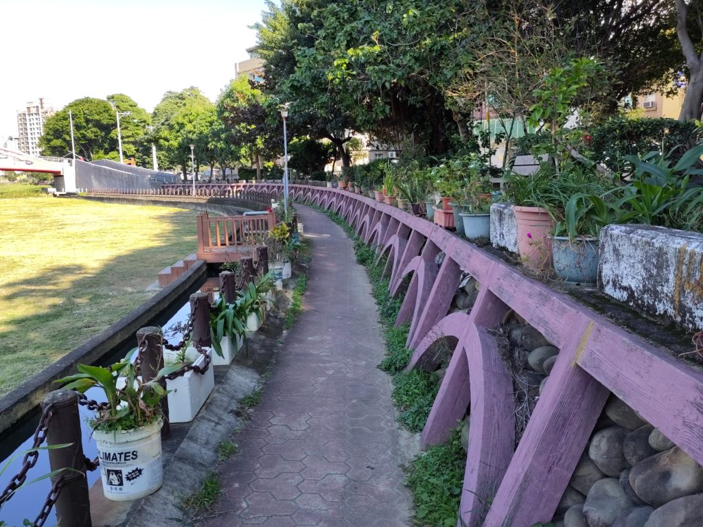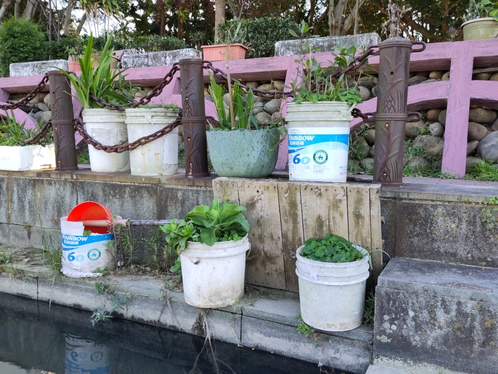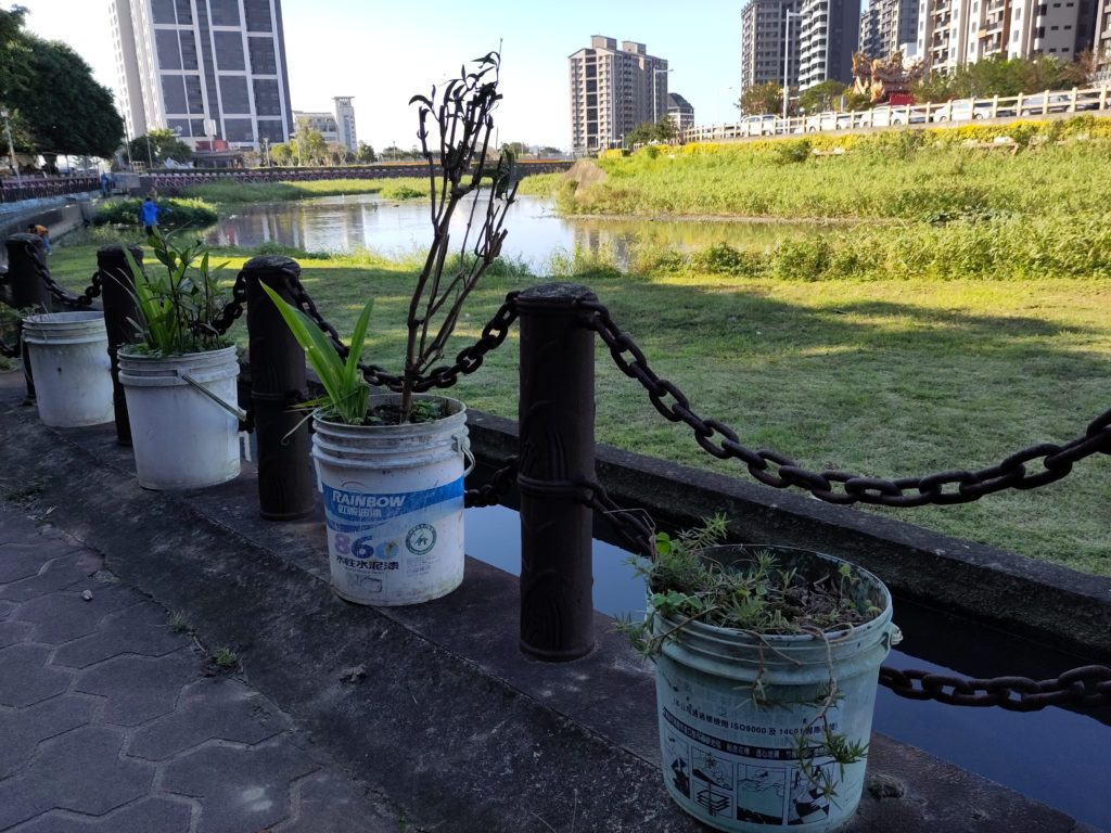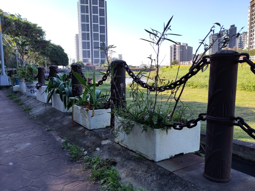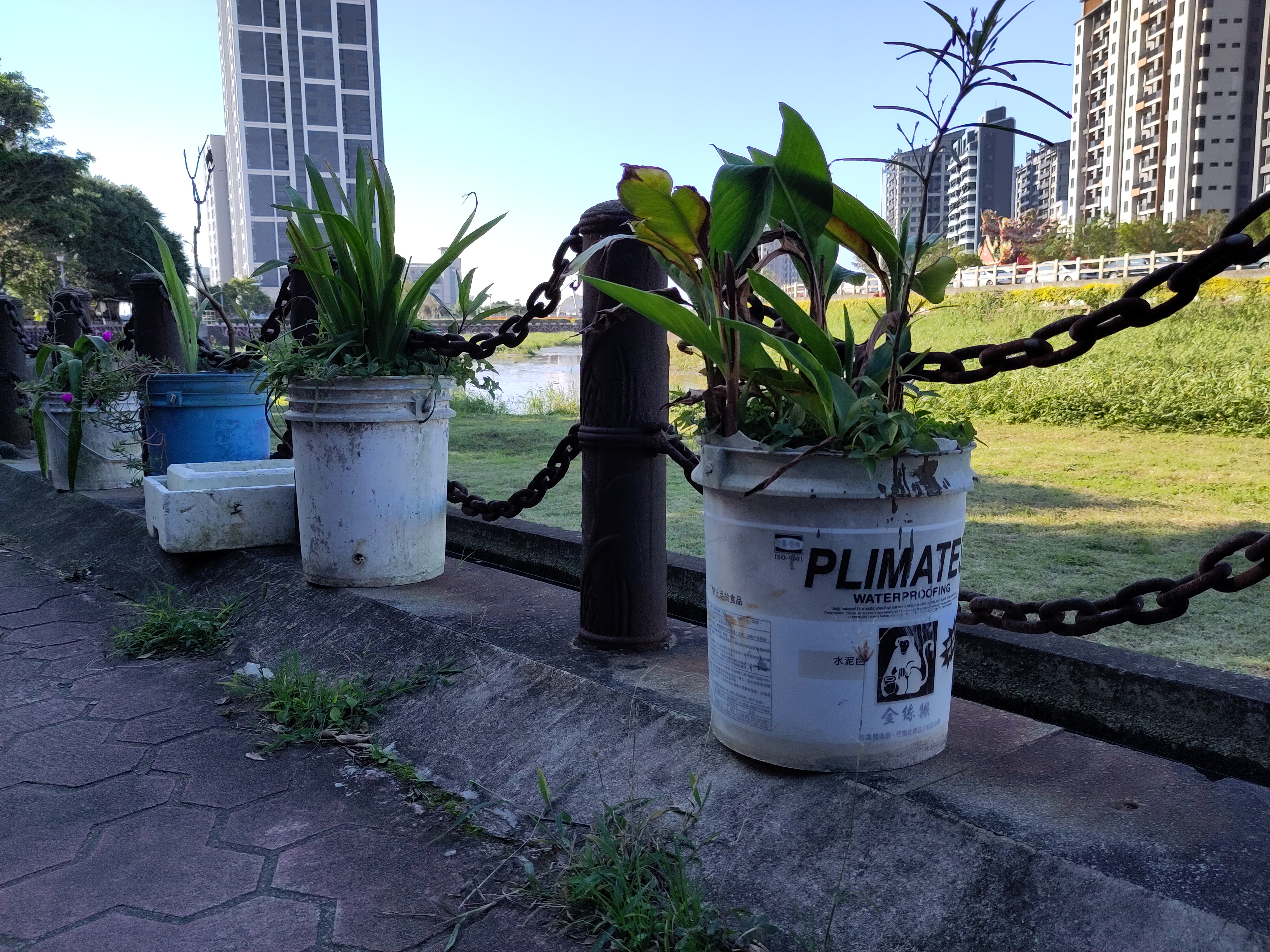 After passing under a bright red bridge I came to what can best be described as a lawn. Right there in the middle of the river is a plot of land with grass growing on it. I had planned to turn back after the bridge but this was odd enough to pique my interest and I decided to keep exploring. It was lucky I did because a short distance down the path from the red bridge is the reason this park ended up on my growing list of strange places in Taiwan: a seemingly random collection of pot plants. There’s every kind of pot you can imagine, from discarded old paint buckets to Styrofoam boxes to glazed ceramic ones, and they’re lined up along both sides of the path. The plants in them are just as varied as the pots, from snake plants to roses and everything in-between. There wouldn’t be anything strange about it in someone’s backyard but here in a public park it feels extremely out of place.