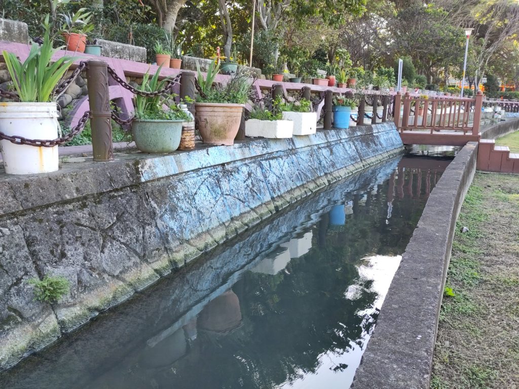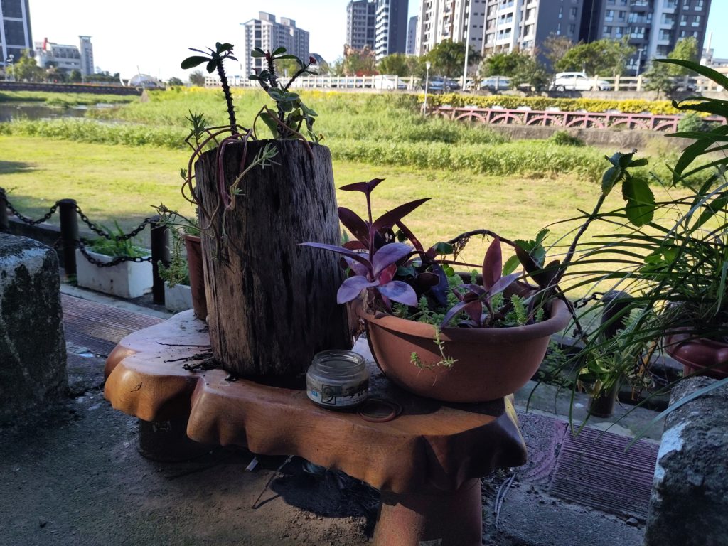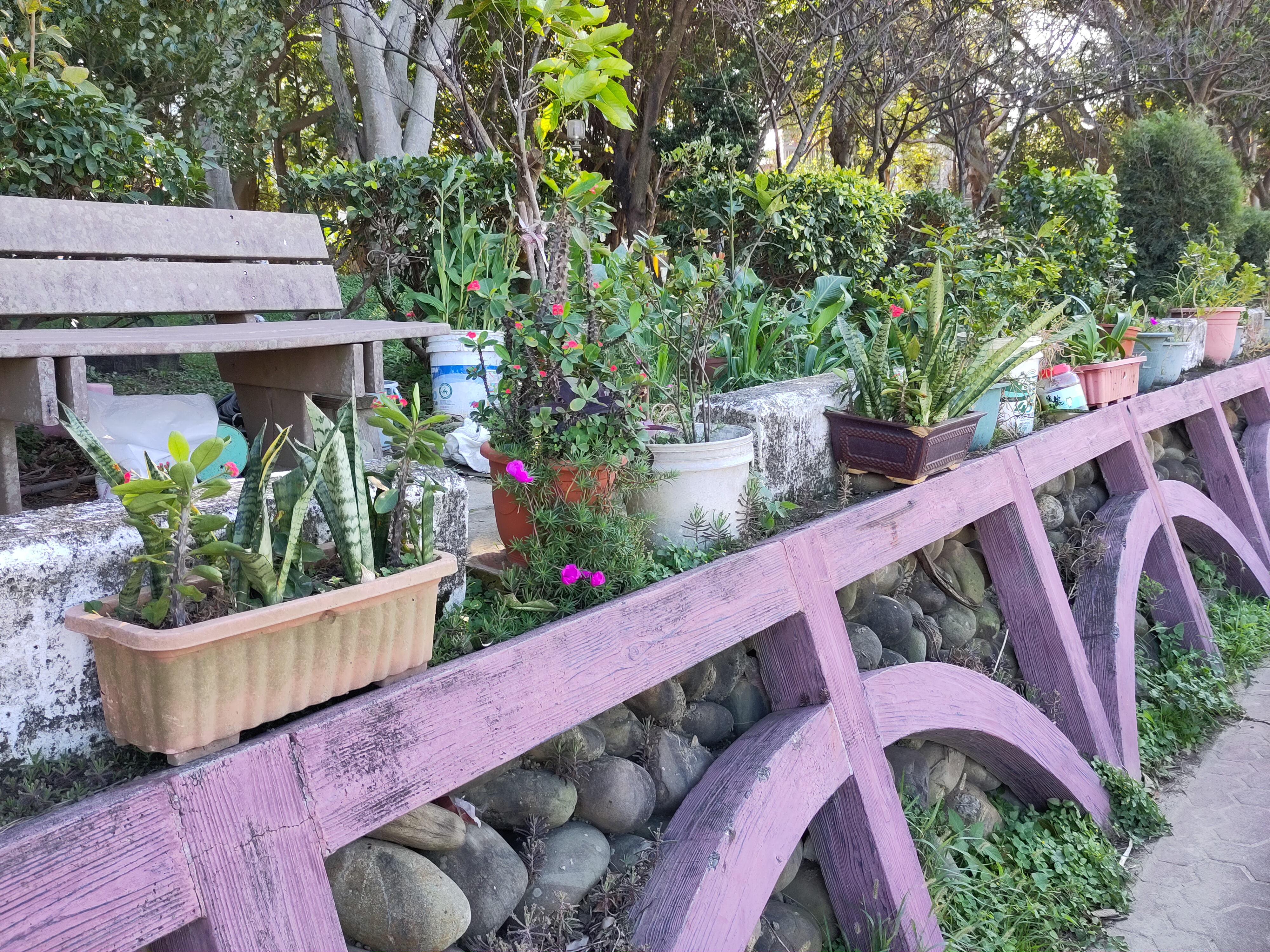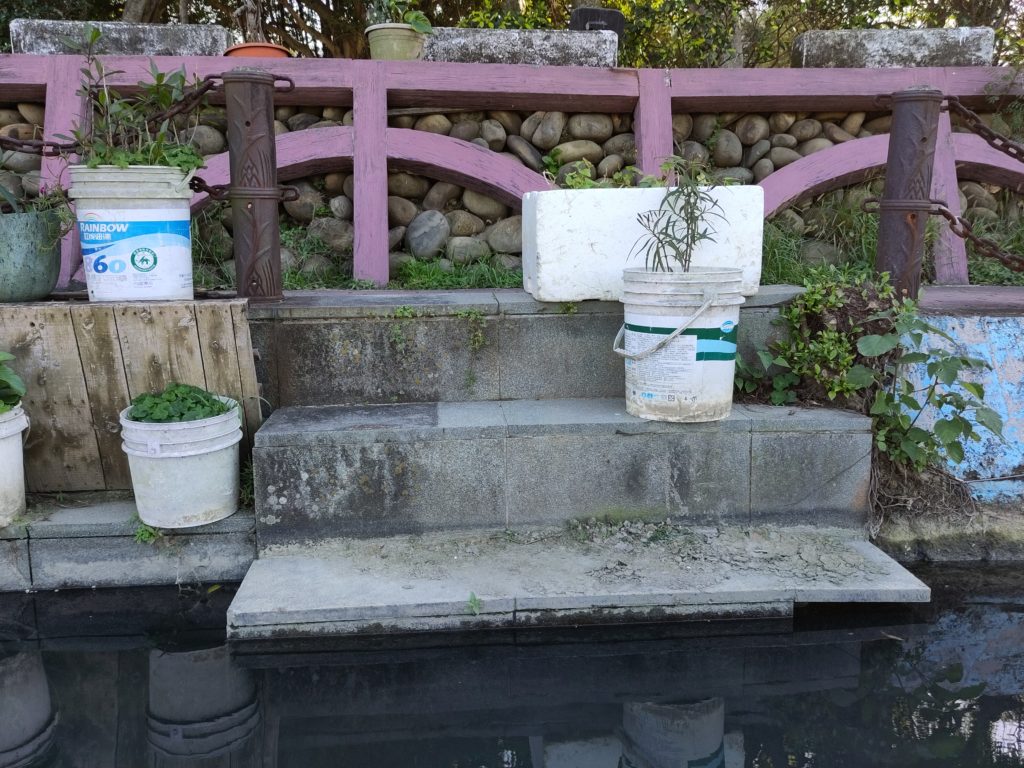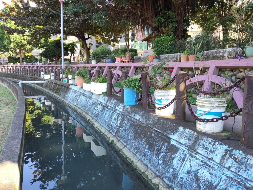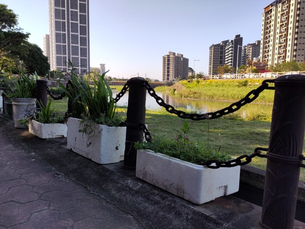 After passing under a bright red bridge I came to what can best be described as a lawn. Right there in the middle of the river is a plot of land with grass growing on it. I had planned to turn back after the bridge but this was odd enough to pique my interest and I decided to keep exploring. It was lucky I did because a short distance down the path from the red bridge is the reason this park ended up on my growing list of strange places in Taiwan: a seemingly random collection of pot plants. There’s every kind of pot you can imagine, from discarded old paint buckets to Styrofoam boxes to glazed ceramic ones, and they’re lined up along both sides of the path. The plants in them are just as varied as the pots, from snake plants to roses and everything in-between. There wouldn’t be anything strange about it in someone’s backyard but here in a public park it feels extremely out of place.