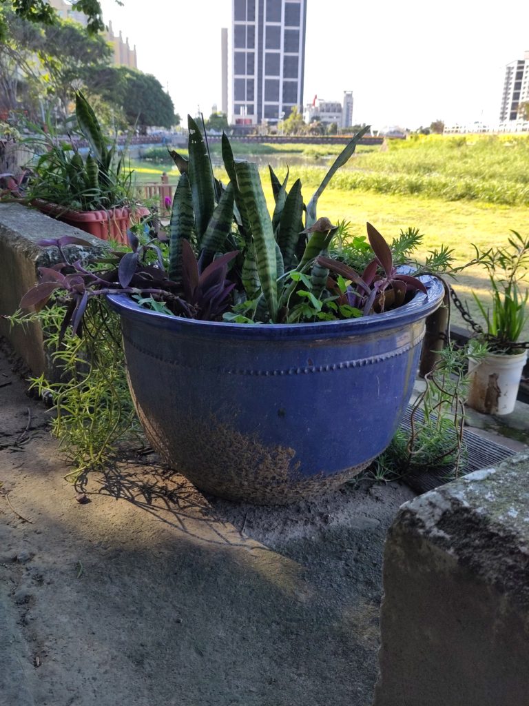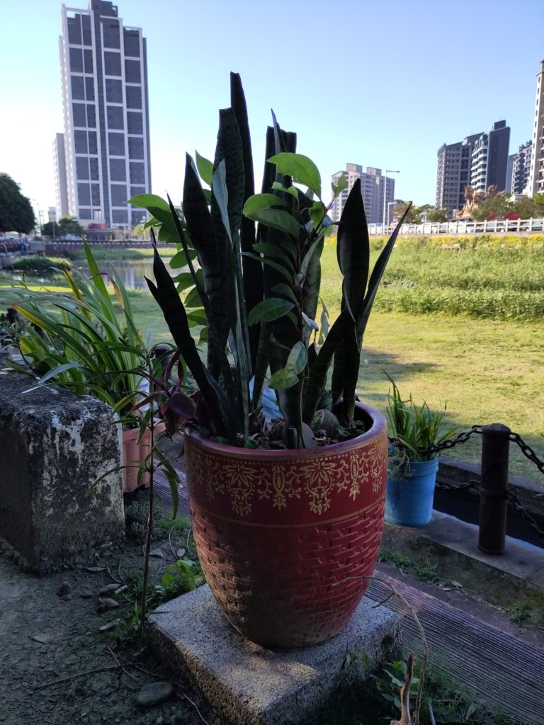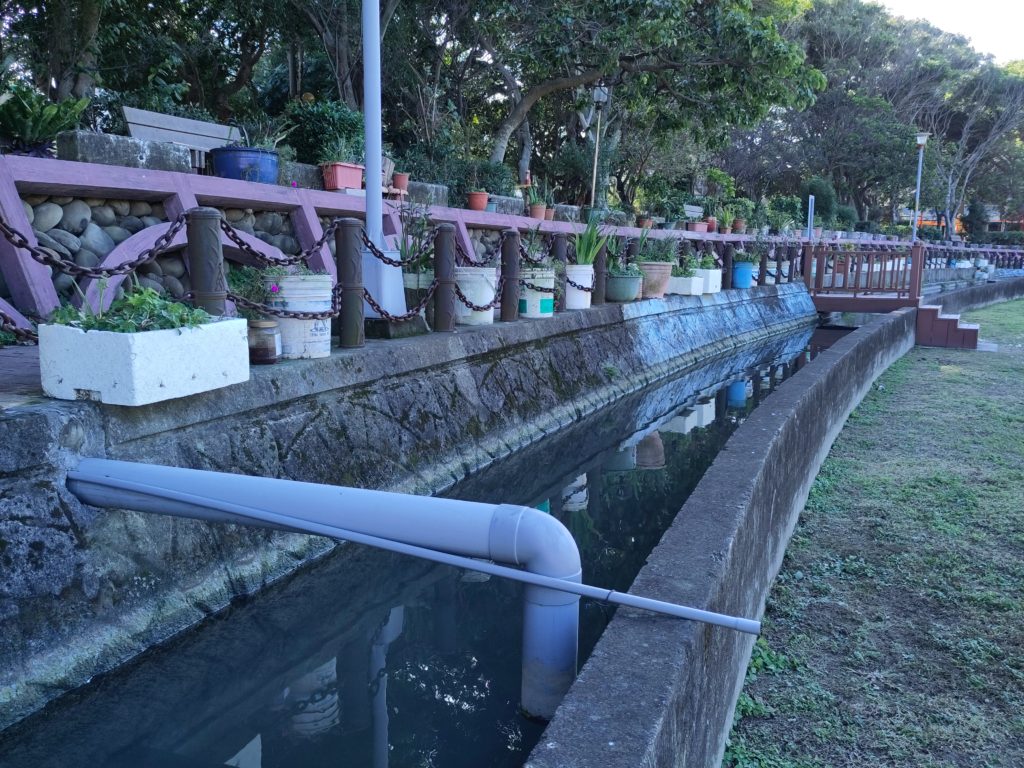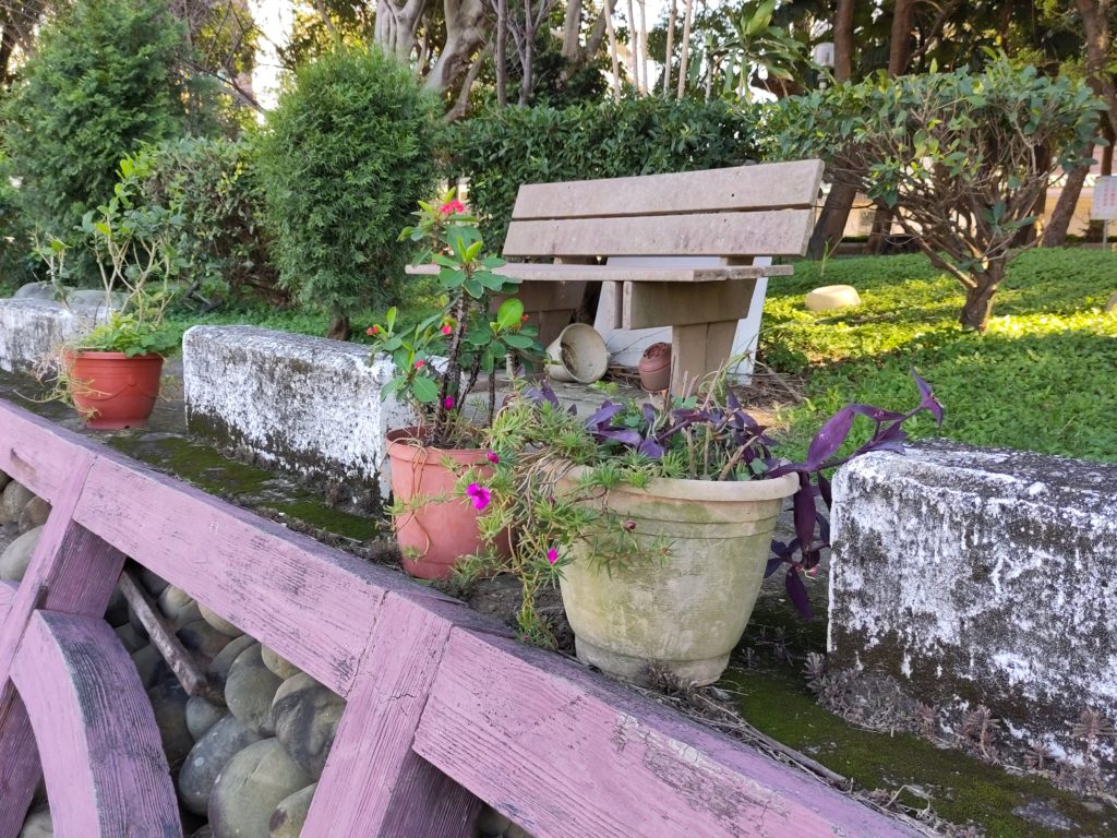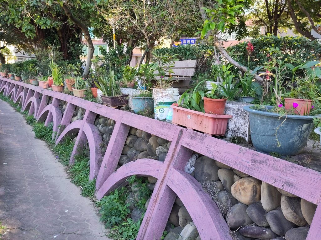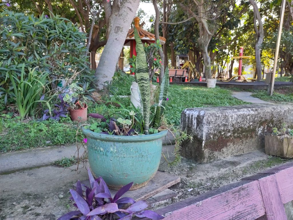 After passing under a bright red bridge I came to what can best be described as a lawn. Right there in the middle of the river is a plot of land with grass growing on it. I had planned to turn back after the bridge but this was odd enough to pique my interest and I decided to keep exploring. It was lucky I did because a short distance down the path from the red bridge is the reason this park ended up on my growing list of strange places in Taiwan: a seemingly random collection of pot plants. There’s every kind of pot you can imagine, from discarded old paint buckets to Styrofoam boxes to glazed ceramic ones, and they’re lined up along both sides of the path. The plants in them are just as varied as the pots, from snake plants to roses and everything in-between. There wouldn’t be anything strange about it in someone’s backyard but here in a public park it feels extremely out of place.
