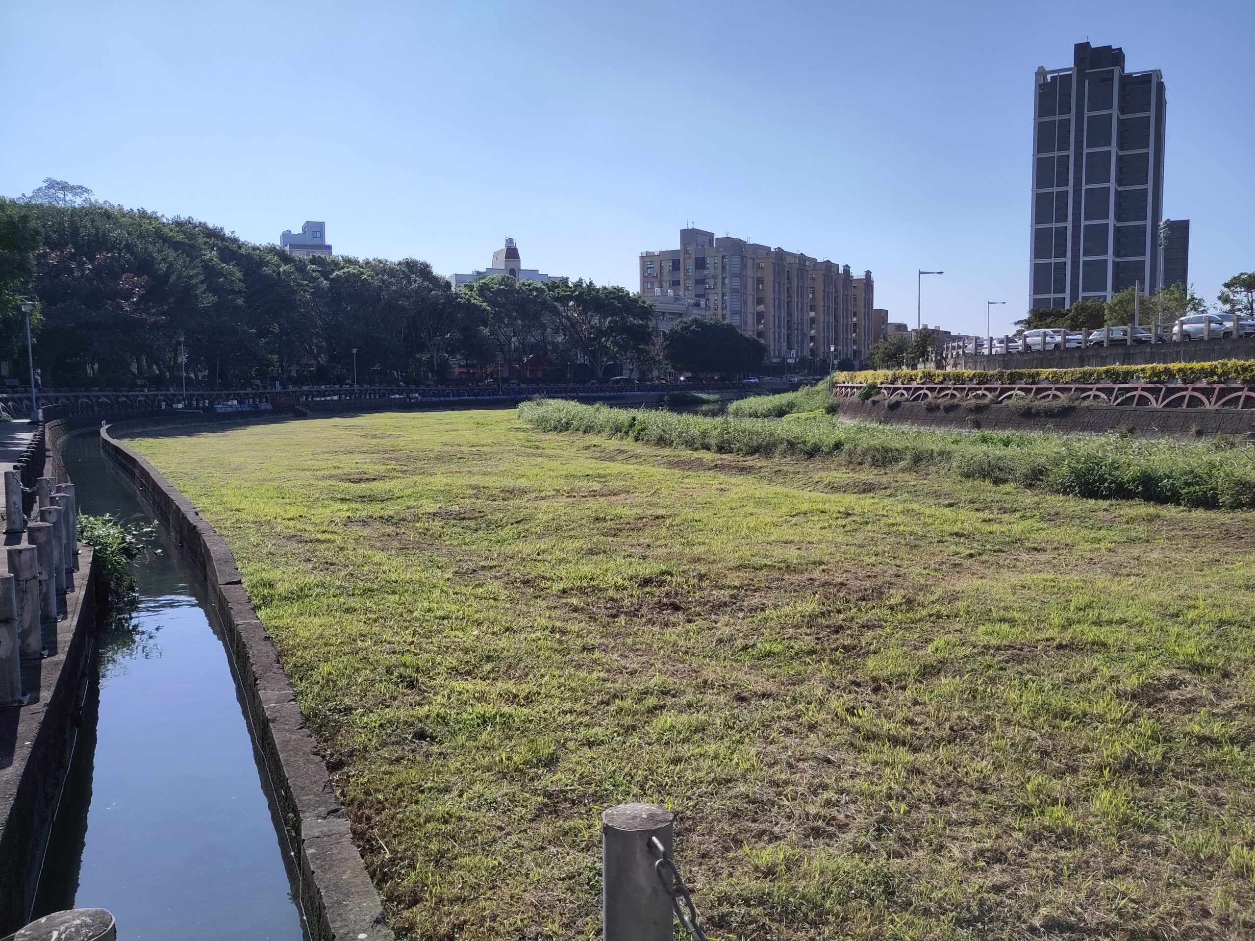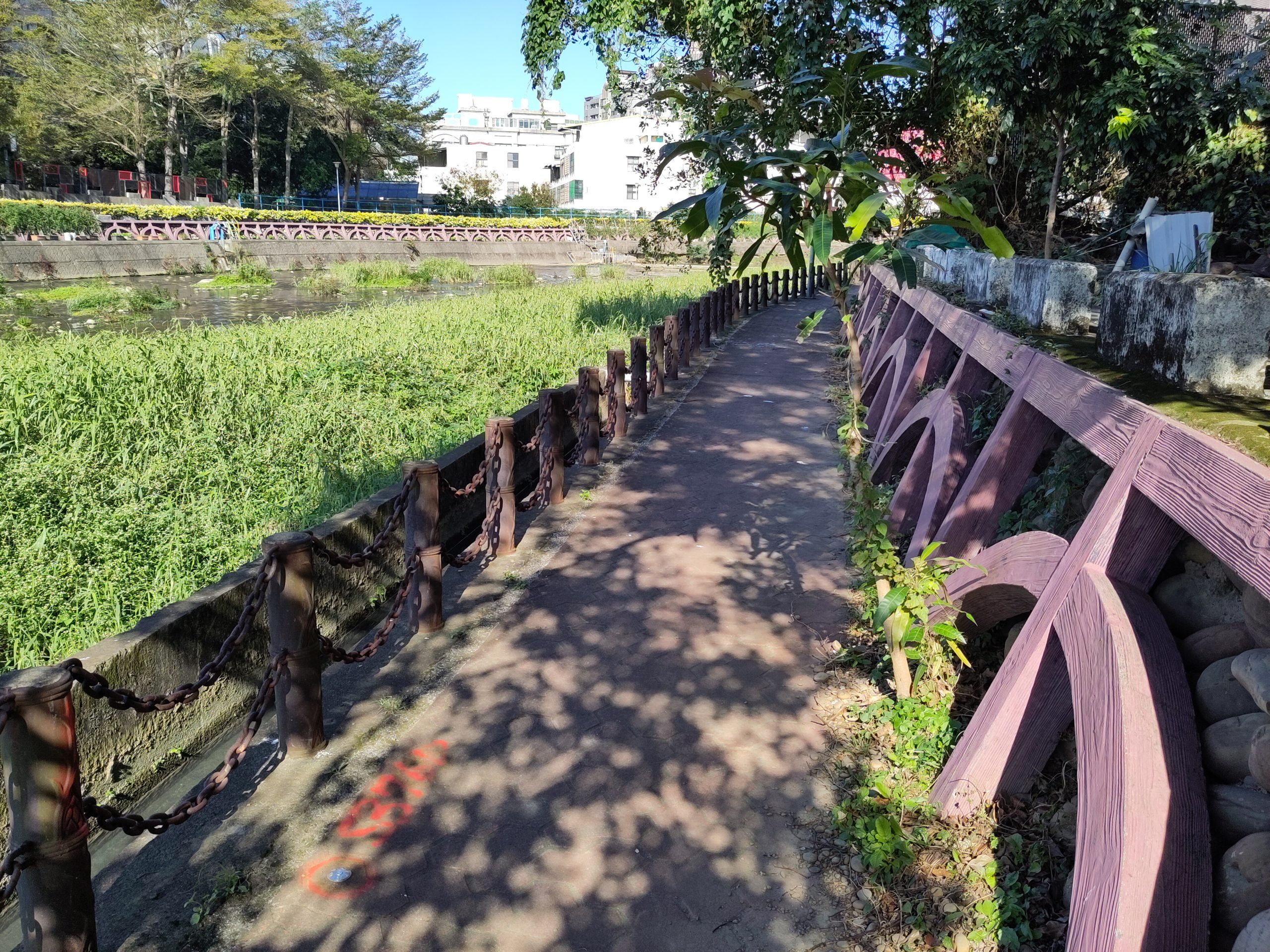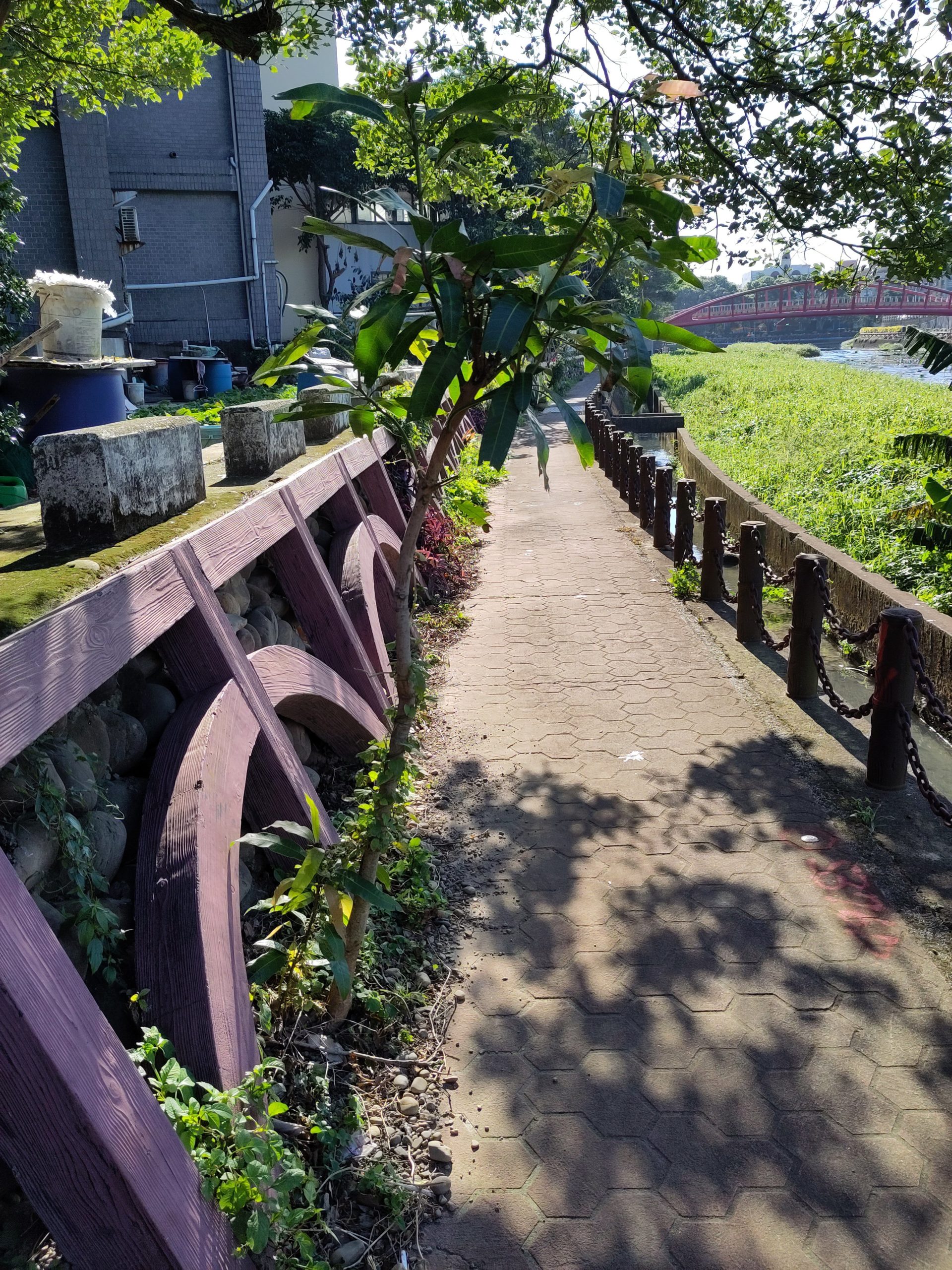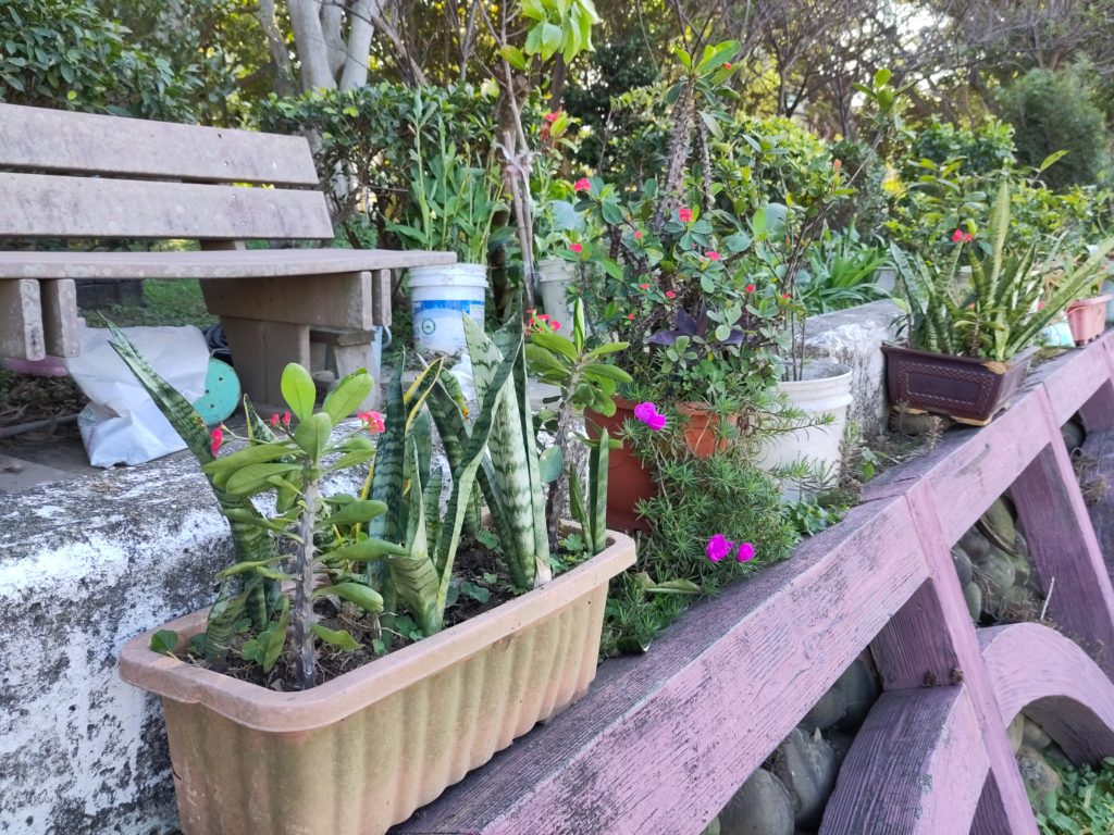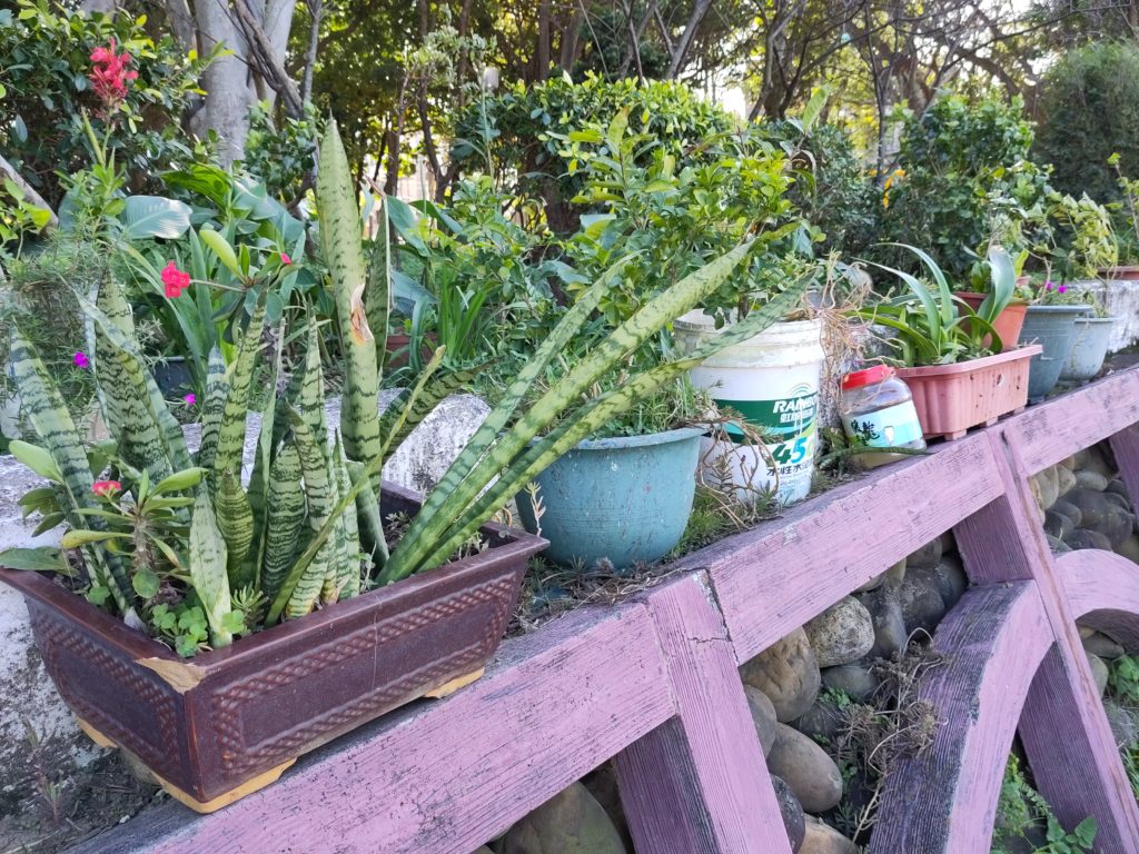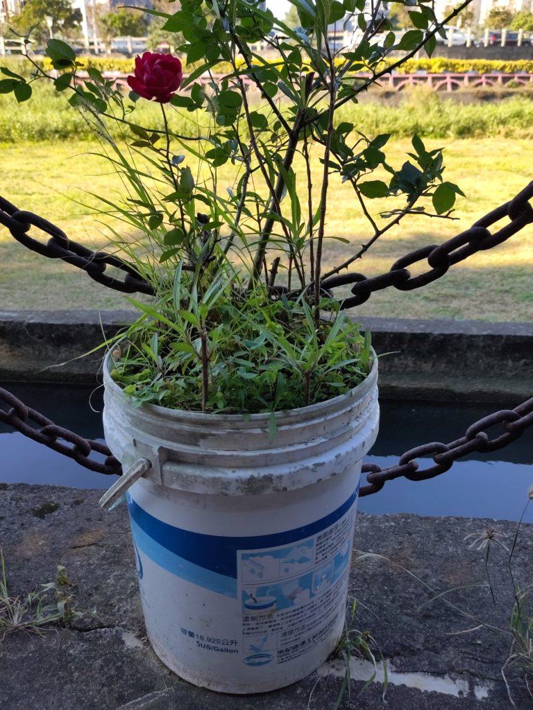 After passing under a bright red bridge I came to what can best be described as a lawn. Right there in the middle of the river is a plot of land with grass growing on it. I had planned to turn back after the bridge but this was odd enough to pique my interest and I decided to keep exploring. It was lucky I did because a short distance down the path from the red bridge is the reason this park ended up on my growing list of strange places in Taiwan: a seemingly random collection of pot plants. There’s every kind of pot you can imagine, from discarded old paint buckets to Styrofoam boxes to glazed ceramic ones, and they’re lined up along both sides of the path. The plants in them are just as varied as the pots, from snake plants to roses and everything in-between. There wouldn’t be anything strange about it in someone’s backyard but here in a public park it feels extremely out of place.