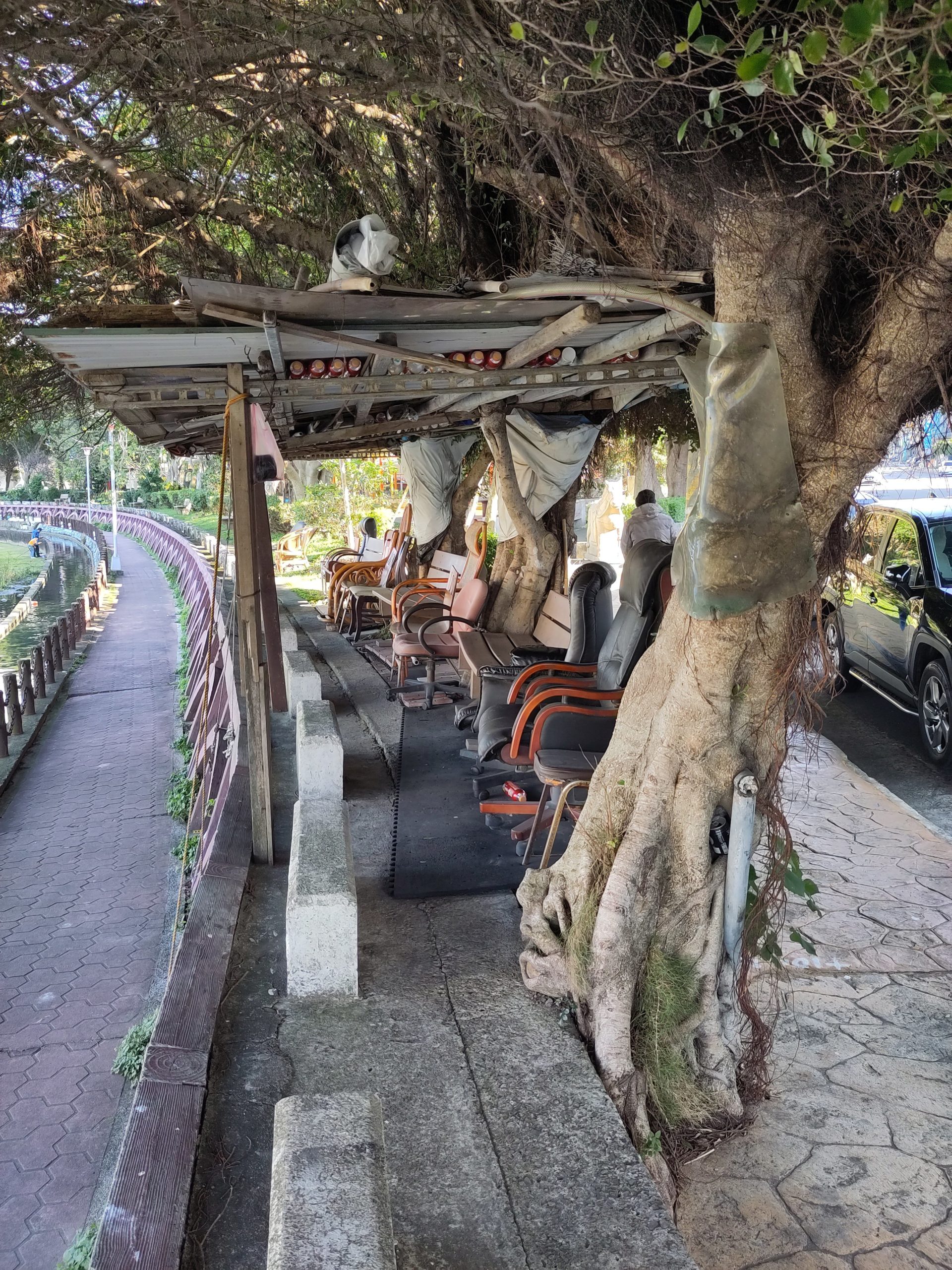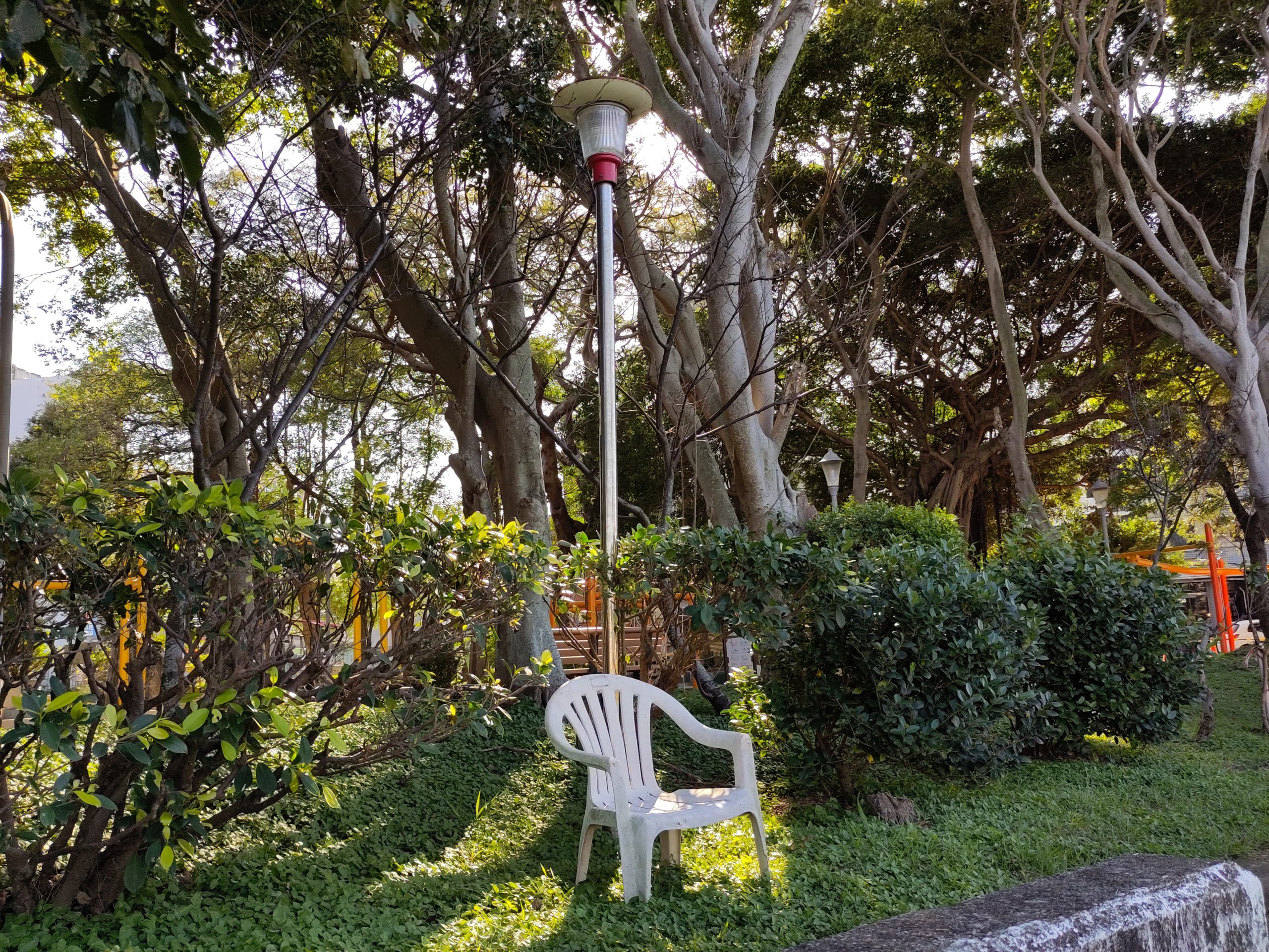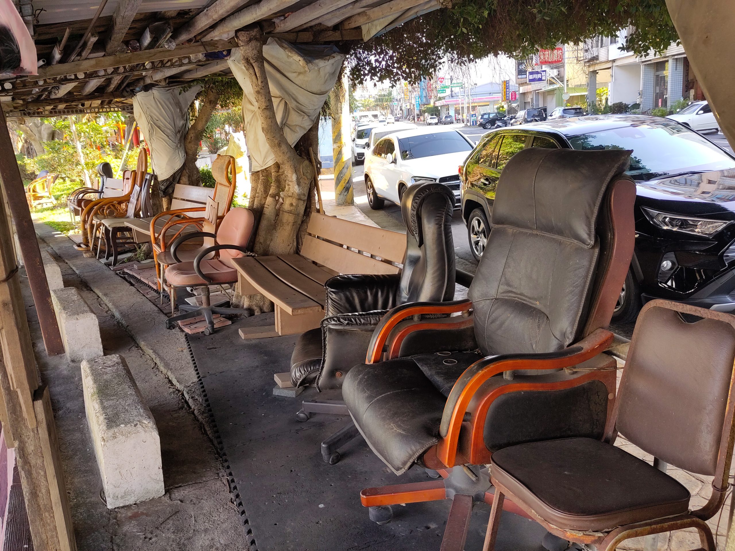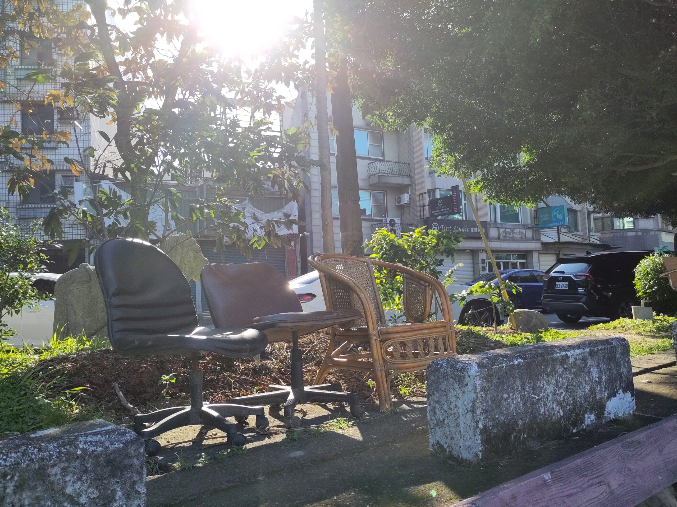 Just a short distance from the pot plants are a number of chairs that look just as random; a couple of office chairs, a few wooden ones and an old leather chair. This is not particularly strange for Taiwan, you can find plenty of old chairs that people have dragged out to their favorite place to sit and chat, but in combination with the pot plants they make this look more like an extension of someone’s backyard than a public park. There’s even an old faded welcome mat nearby that adds to this impression.