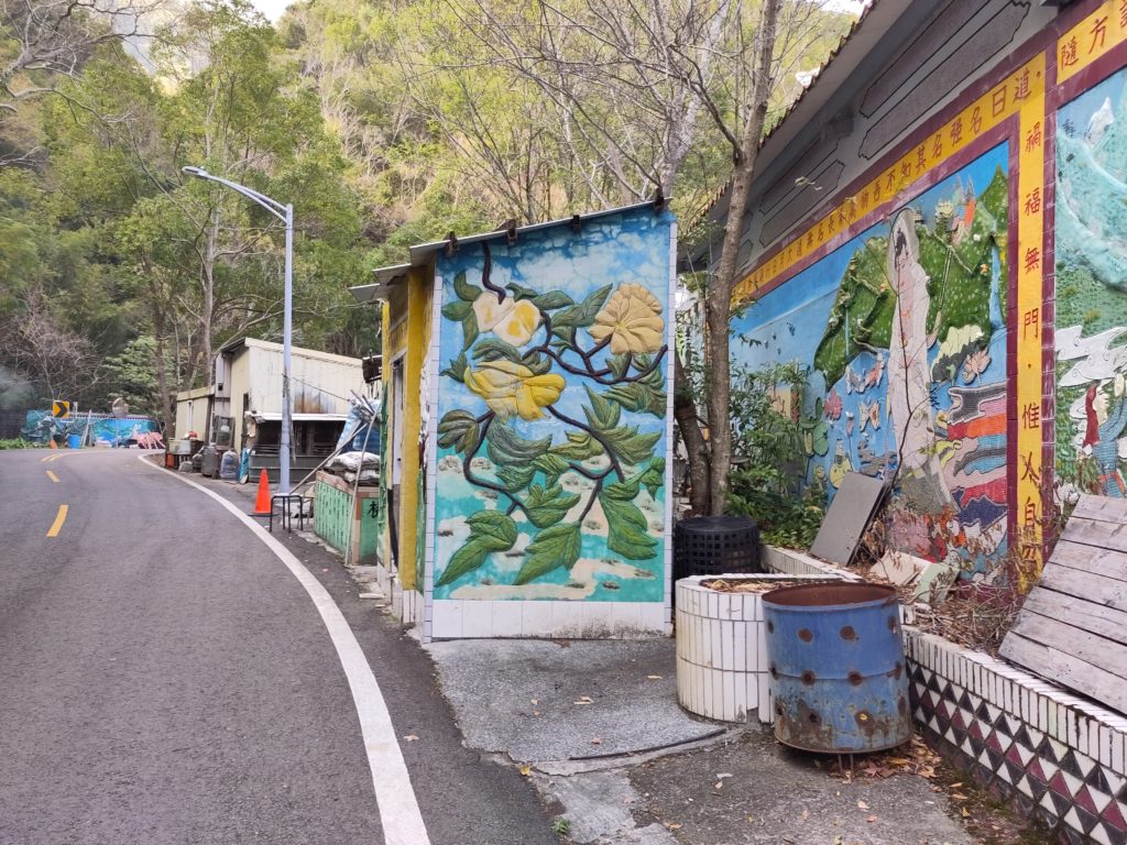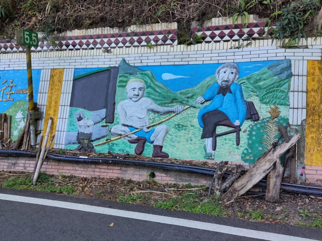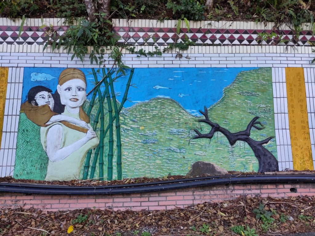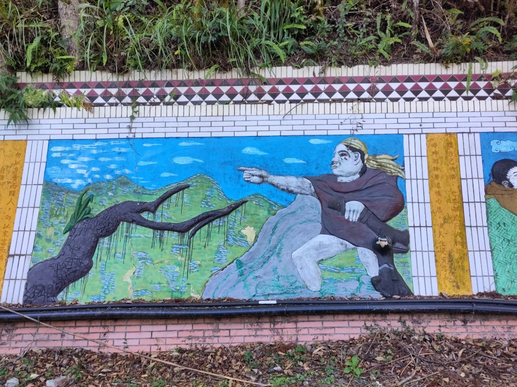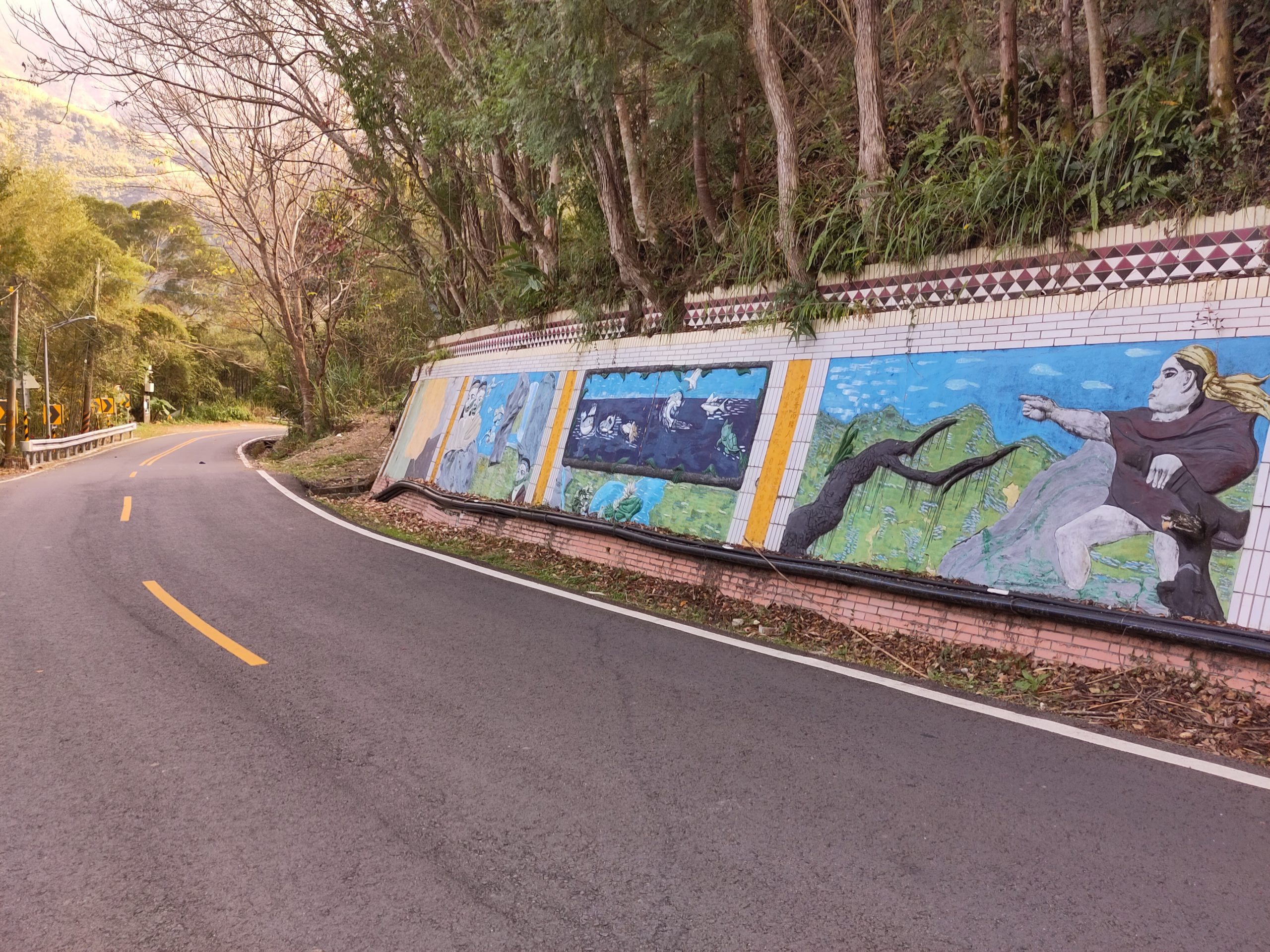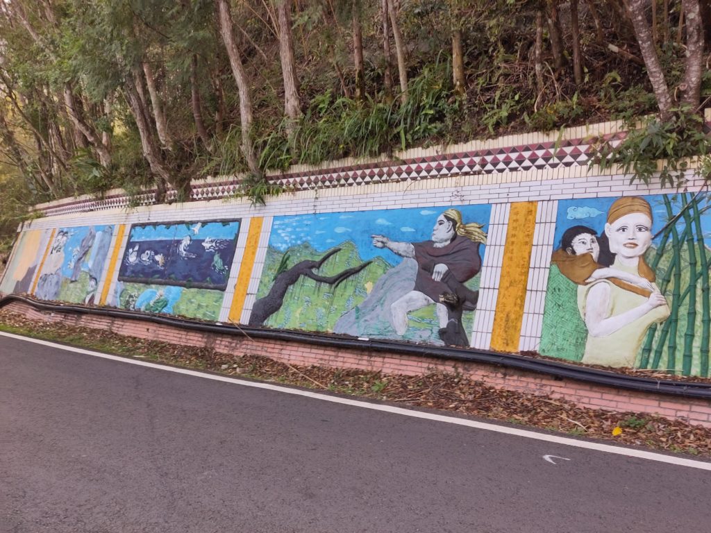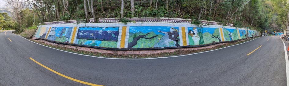 The thing about Taiwan’s countryside is, like Forrest Gump said, like a box of chocolate, you never know what you’re gonna get. Last weekend we went up in the mountains outside Hsinchu without any real plan. As we were driving along a small, rather remote road we rounded a corner and came upon a bunch of large, colorful paintings on the concrete wall next to the road. This was utterly unexpected. This was deep enough into the mountains that you’d expect to see little more than vegetation and waterfalls, yet here was some extremely colorful art. This of course fit my taste for odd places perfectly, so I had to stop the car and take some photos. Here’s what the place looks like: