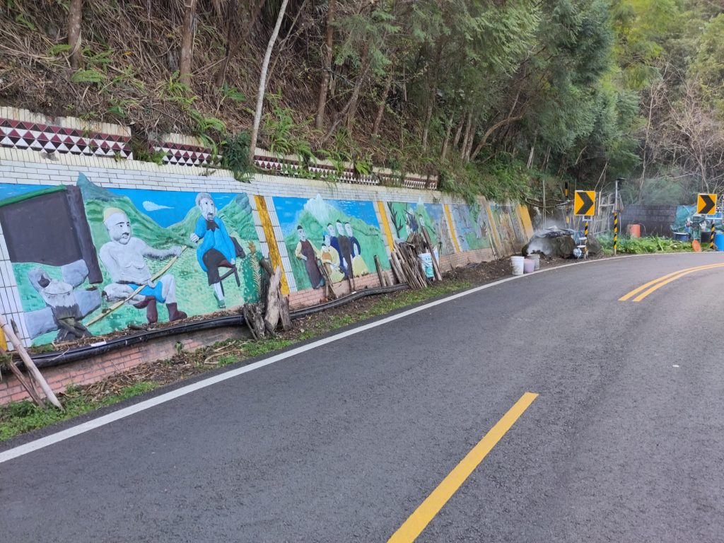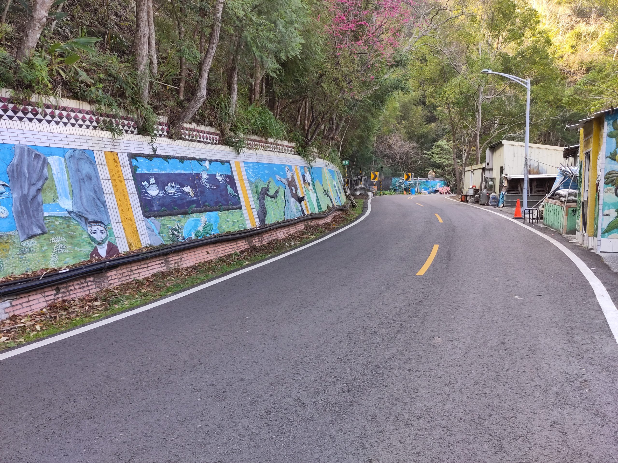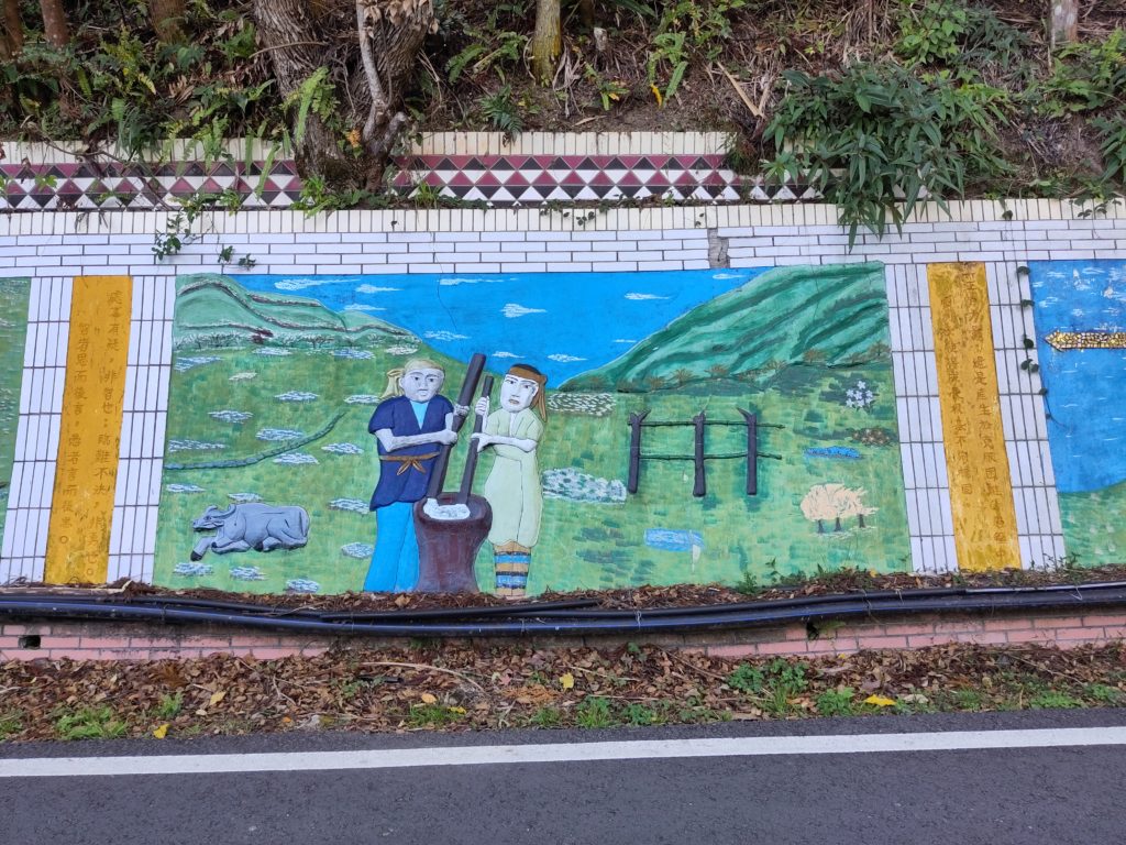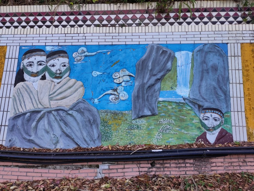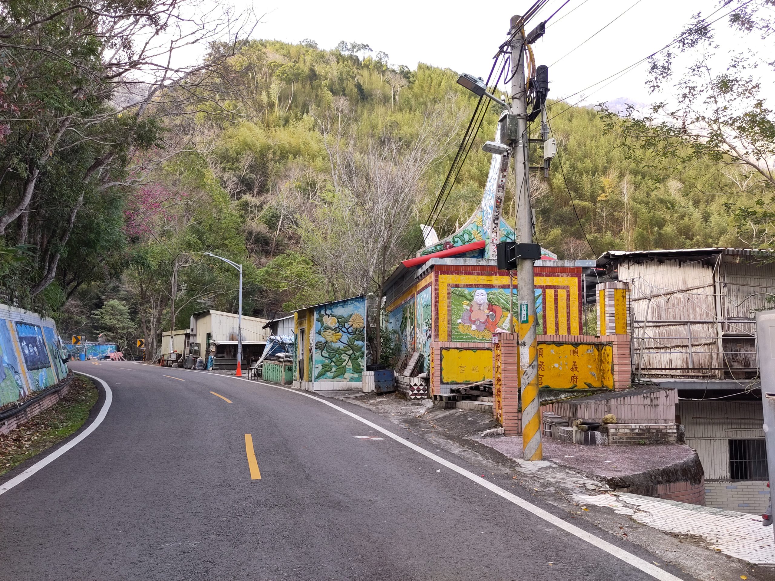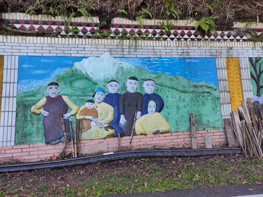 The thing about Taiwan’s countryside is, like Forrest Gump said, like a box of chocolate, you never know what you’re gonna get. Last weekend we went up in the mountains outside Hsinchu without any real plan. As we were driving along a small, rather remote road we rounded a corner and came upon a bunch of large, colorful paintings on the concrete wall next to the road. This was utterly unexpected. This was deep enough into the mountains that you’d expect to see little more than vegetation and waterfalls, yet here was some extremely colorful art. This of course fit my taste for odd places perfectly, so I had to stop the car and take some photos. Here’s what the place looks like: