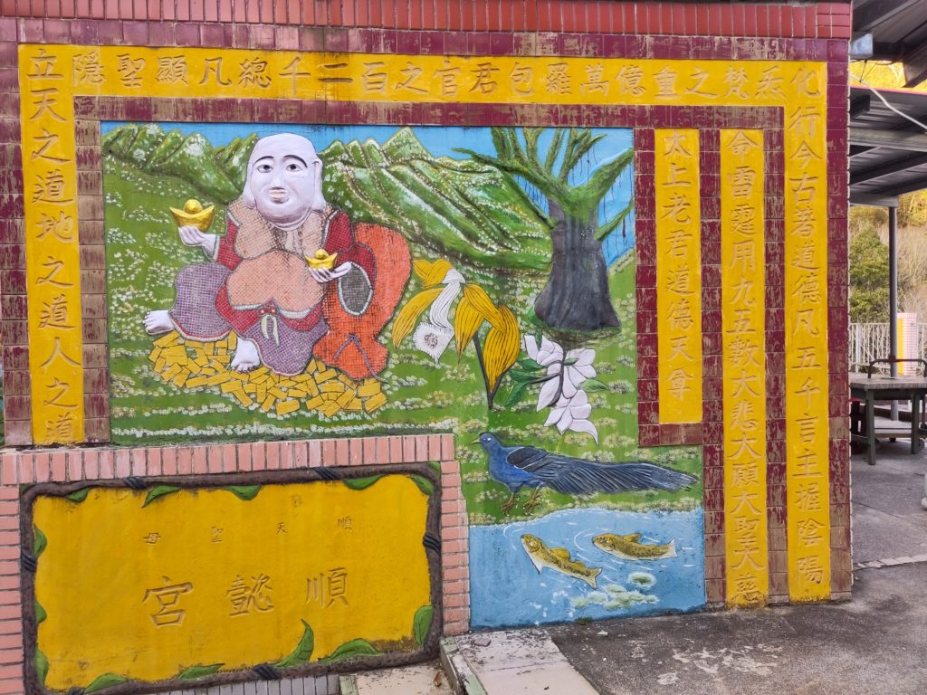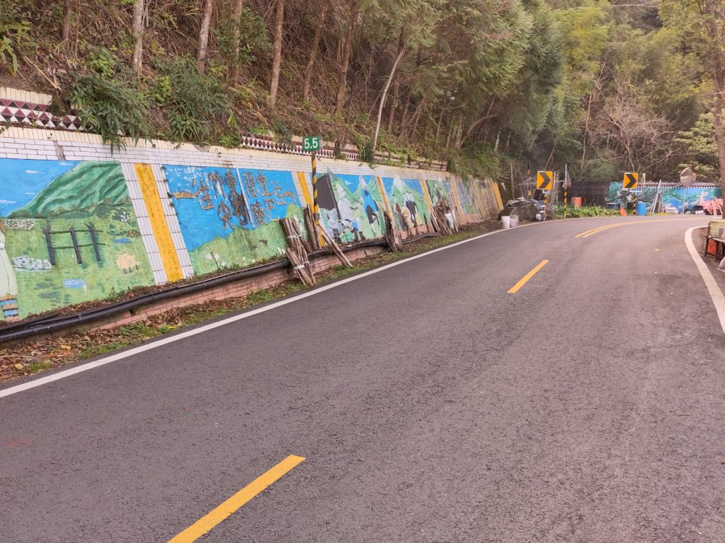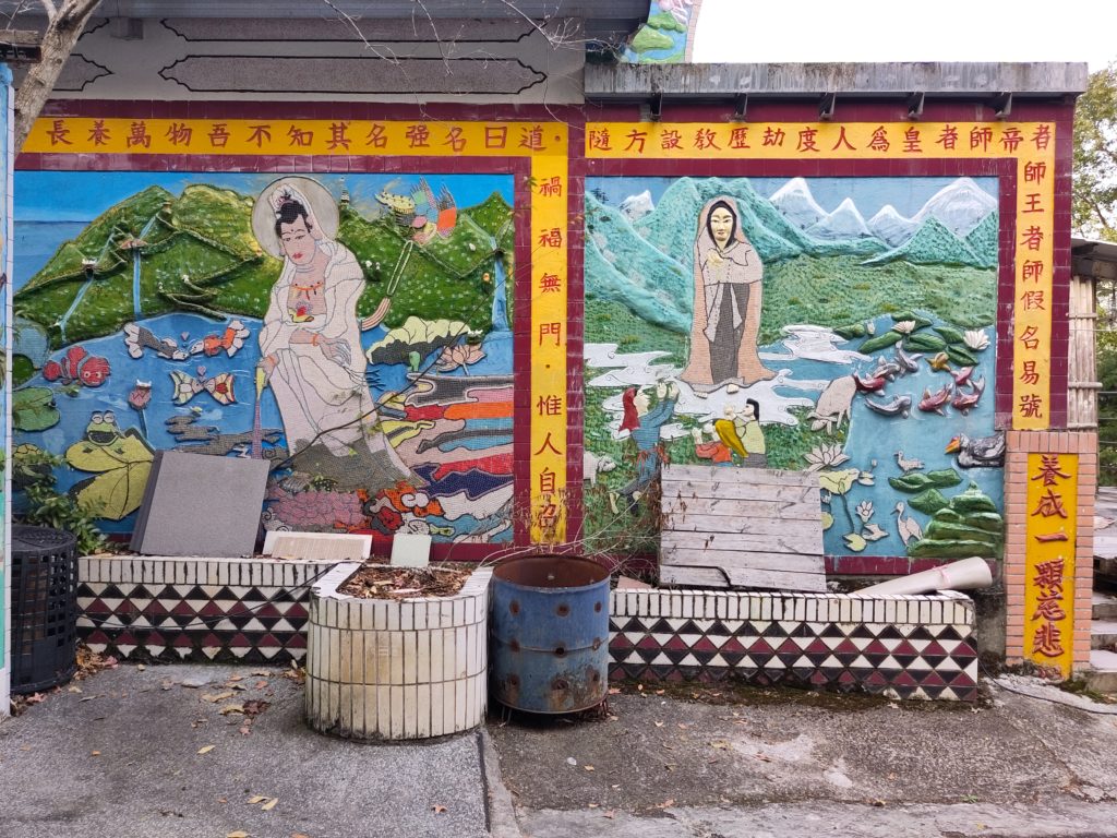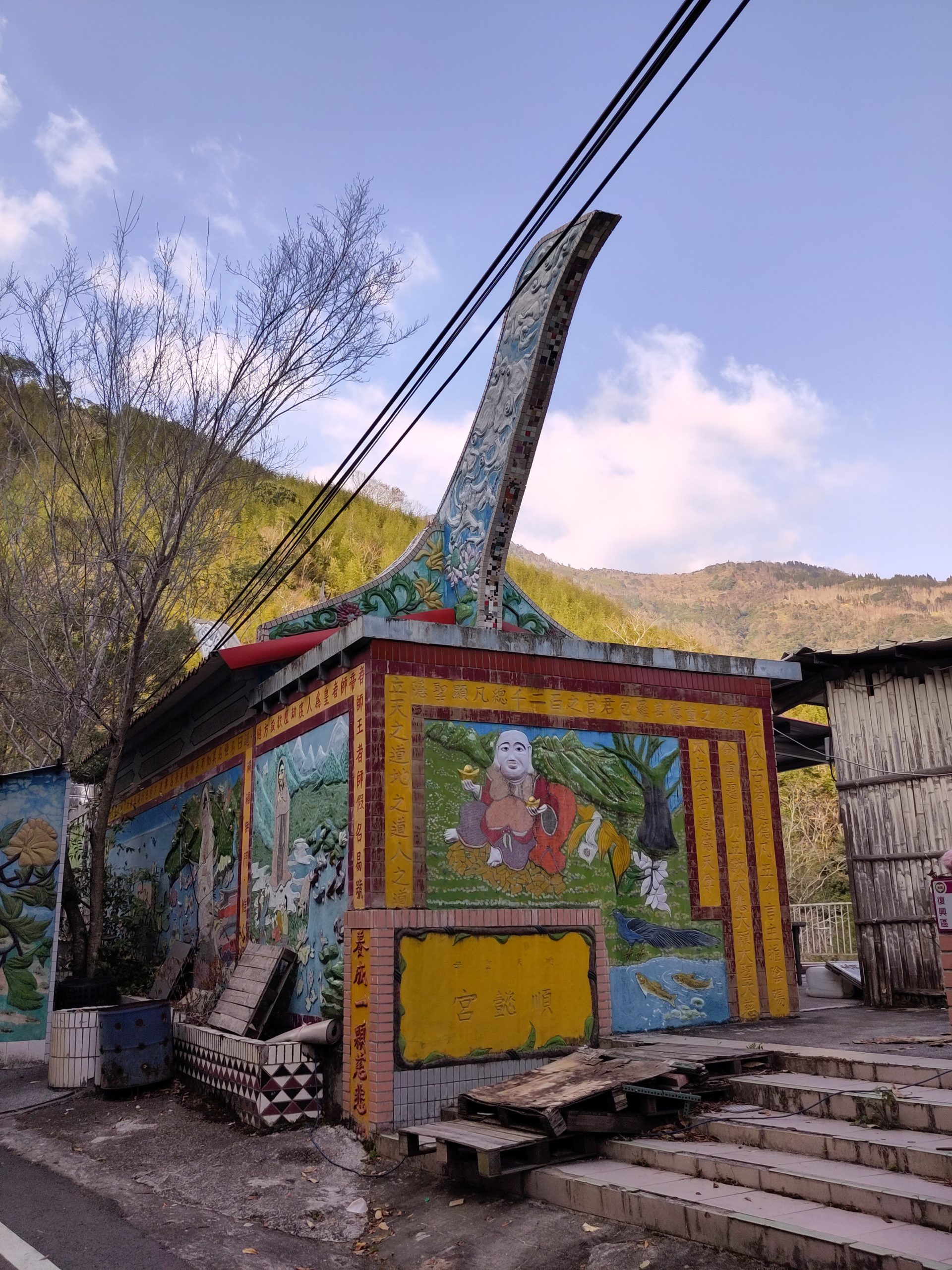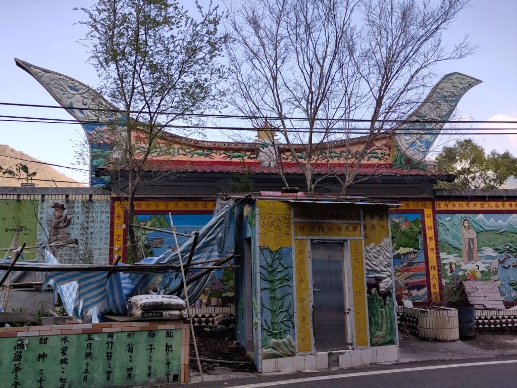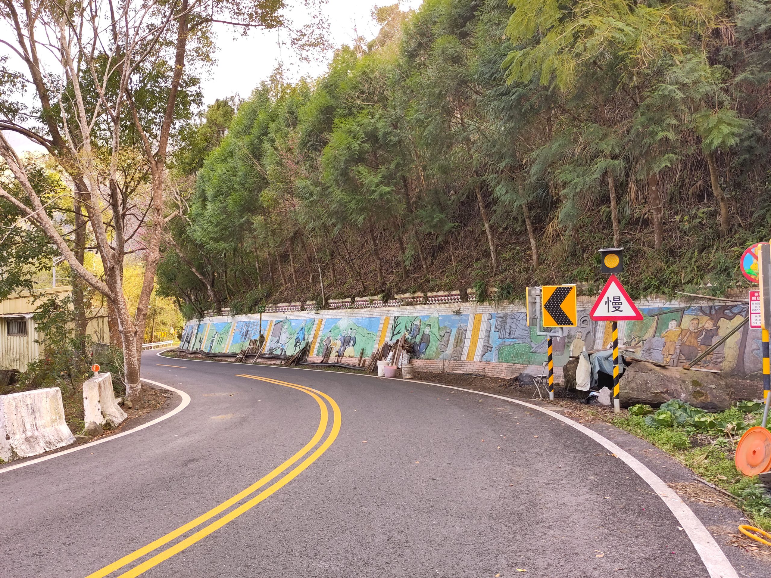 The thing about Taiwan’s countryside is, like Forrest Gump said, like a box of chocolate, you never know what you’re gonna get. Last weekend we went up in the mountains outside Hsinchu without any real plan. As we were driving along a small, rather remote road we rounded a corner and came upon a bunch of large, colorful paintings on the concrete wall next to the road. This was utterly unexpected. This was deep enough into the mountains that you’d expect to see little more than vegetation and waterfalls, yet here was some extremely colorful art. This of course fit my taste for odd places perfectly, so I had to stop the car and take some photos. Here’s what the place looks like: