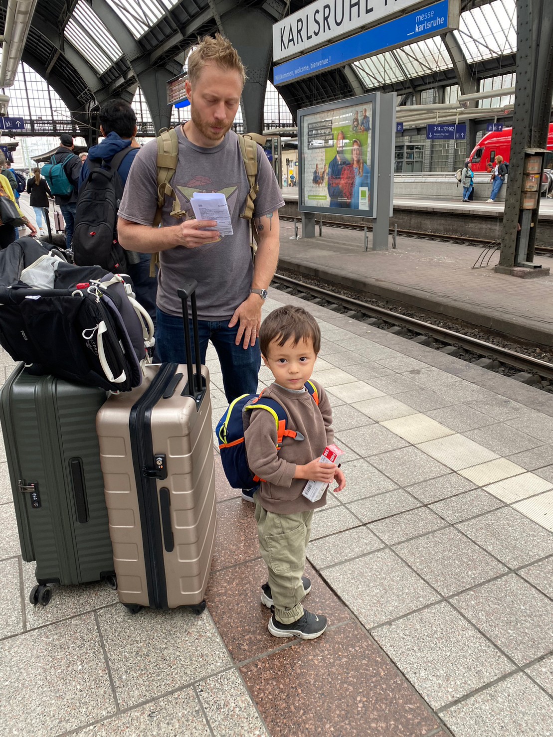 I had gotten it into my head that it would be a good idea to take the train from France to Sweden. I thought so for a couple of reasons. First, I think taking a train is much more enjoyable than flying since you can look out the window at the passing landscape. Second, we’ve taken the train in Taiwan a few times and Tantan always enjoyed it. Third, it’s a lot more convenient than flying and for shortish distances it’s almost equally fast. Fourth and last, it’s much more environmentally friendly than flying. Hamburg, not far from Denmark, is home to the world’s largest model railway, which I thought could be fun for Tantan. I figured we could take the train to Hamburg, stay one night so we could visit the model railway, then continue to Sweden the next day. I booked a train from Karlsruhe (just north of the border) to Hamburg that would arrive with plenty of time left before the model railway closed, I pre-booked tickets for the model railway to avoid long lines, and my mom helped us book a nice hotel in the city center. I also booked a train to Sweden for the following day which did have several transfers but I thought we could handle it. As far as I was concerned it was a pretty good plan.