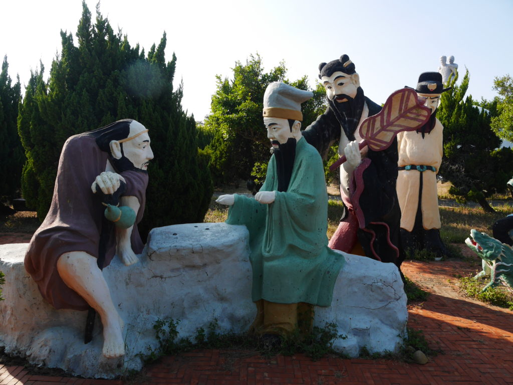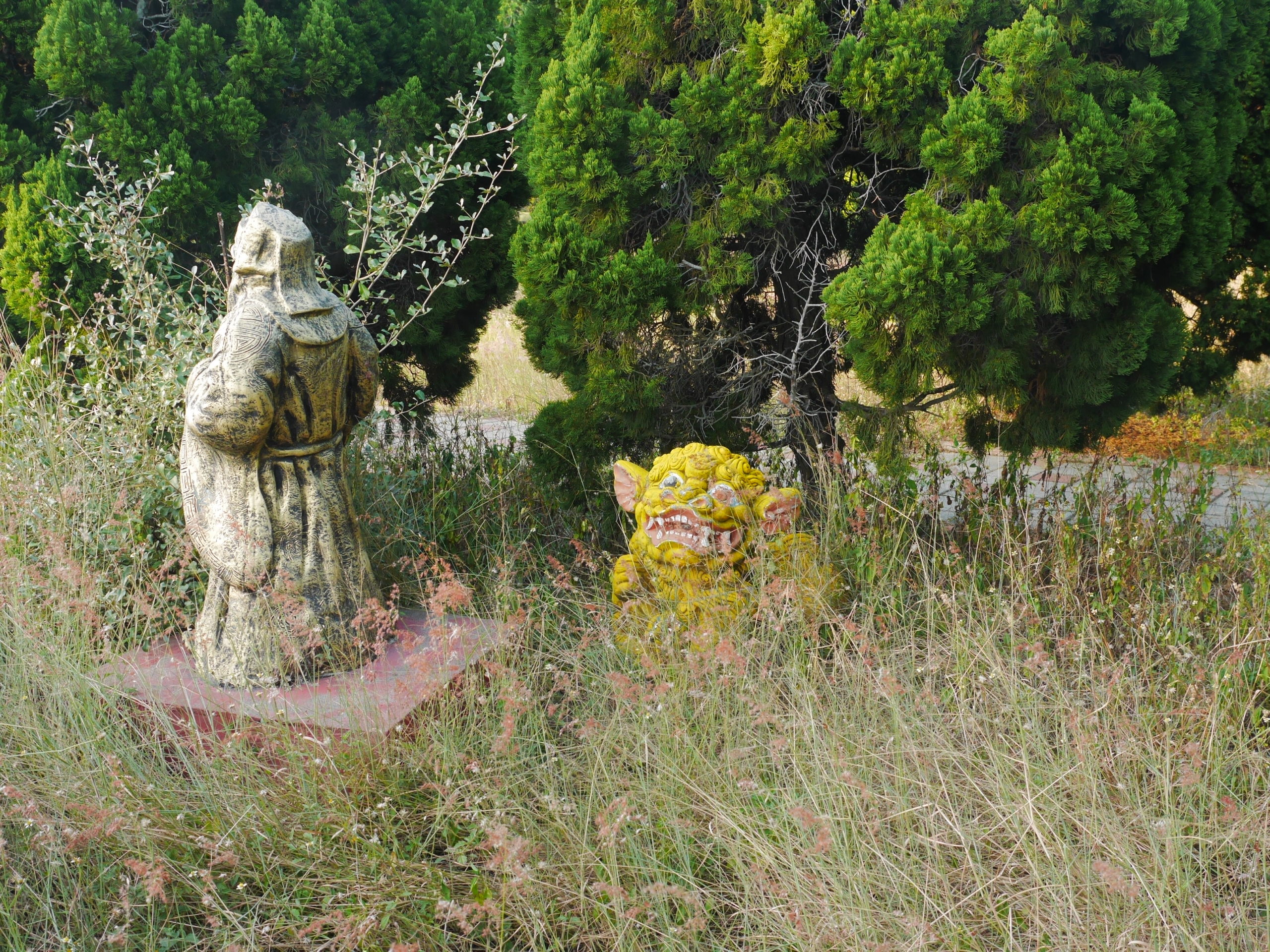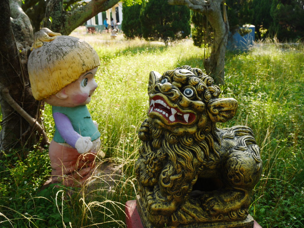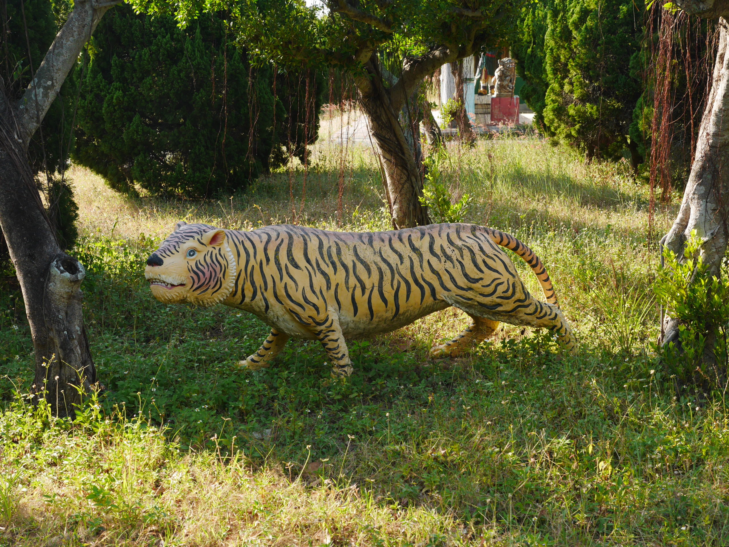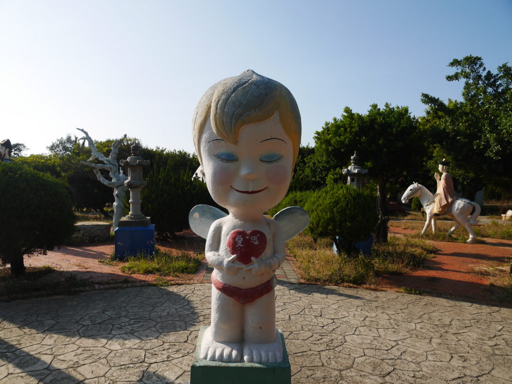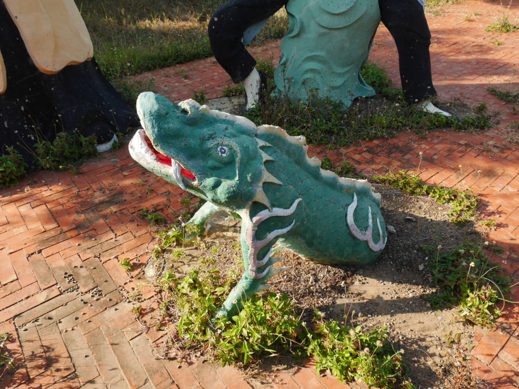 One such place is Qiumaoyuan statue park. As you can see from the map link, it is marked as a tourist spot, but you have to zoom in a fair bit in order for it to show up. There are a couple different aspects that make it really odd and, as you can guess, worth visiting for anyone with even a passing interest in such things. First is that the collection of statues it houses is so incongruous; there’s a wild mix of everything from Buddha to Jesus to animals to political propaganda and anything in between – there’s even a random cowboy for some reason. Second is the low quality of the statues. Many of them have been made with fiber glass, a material which is really not suitable Taiwan’s climate. Moreover, their design is rather sub-par, with many of the them – especially the animals – having a facial expression that makes them look either surprised and/or dumb. Third is that there are a number of temples inside the park that all have the same general size and shape, but are clearly meant for worshiping different gods; sort of “select your preferred religion”. Fourth is the fact that the place is in a state of neglect. Some parts of it are overgrown with weeds, several of the statues are cracked and broken, and there’s a general feeling about the whole place that they do just enough maintenance to keep it from falling into ruin completely. At this point I think it’s time to show some pictures so you can see for yourself.