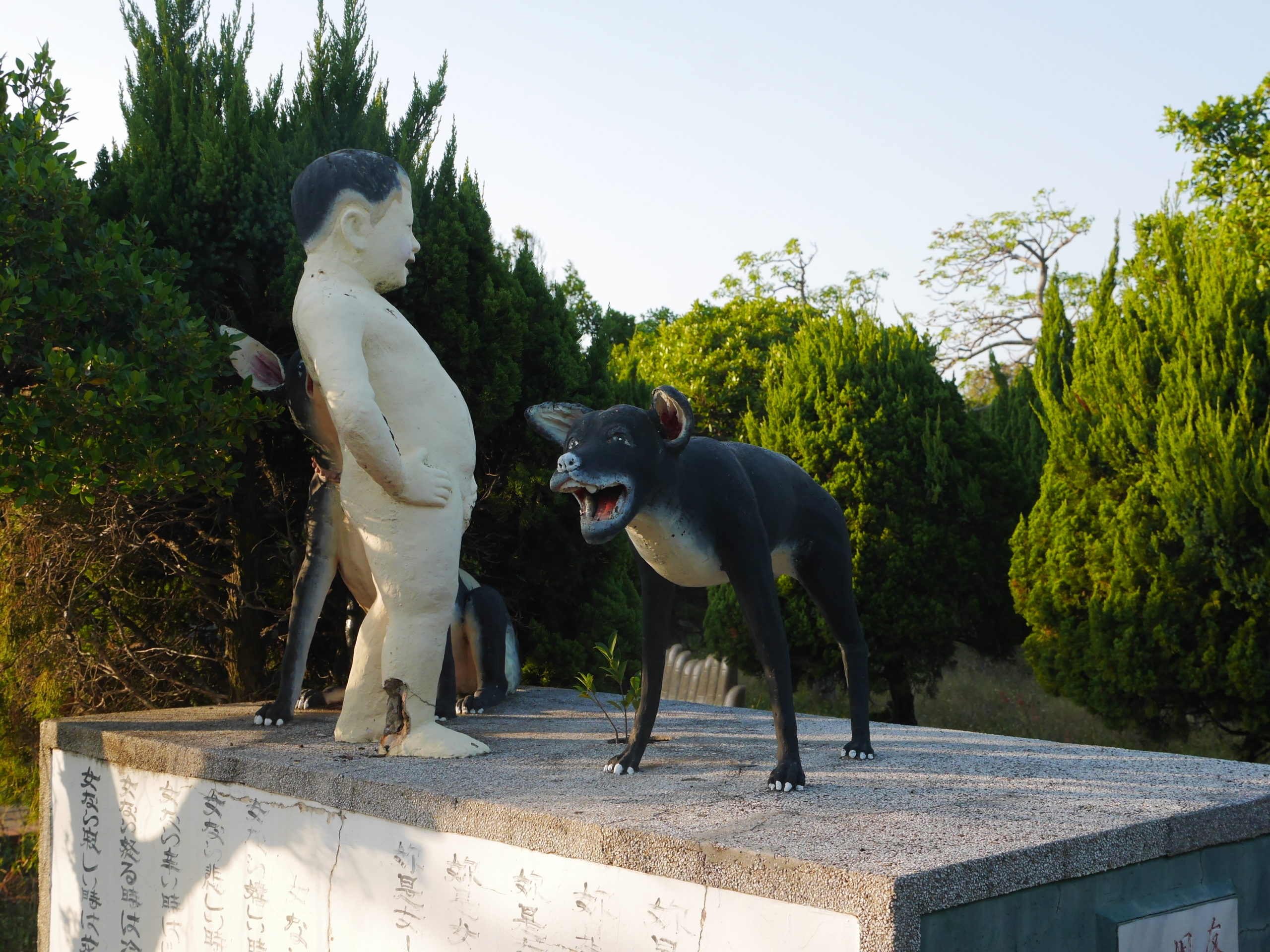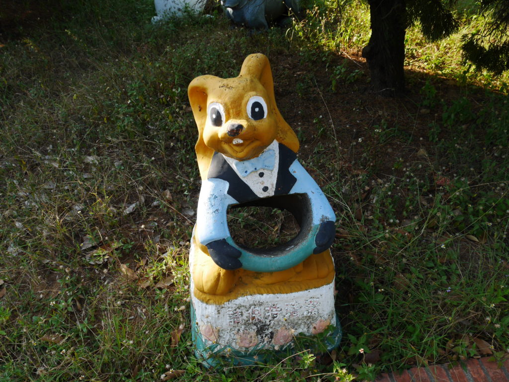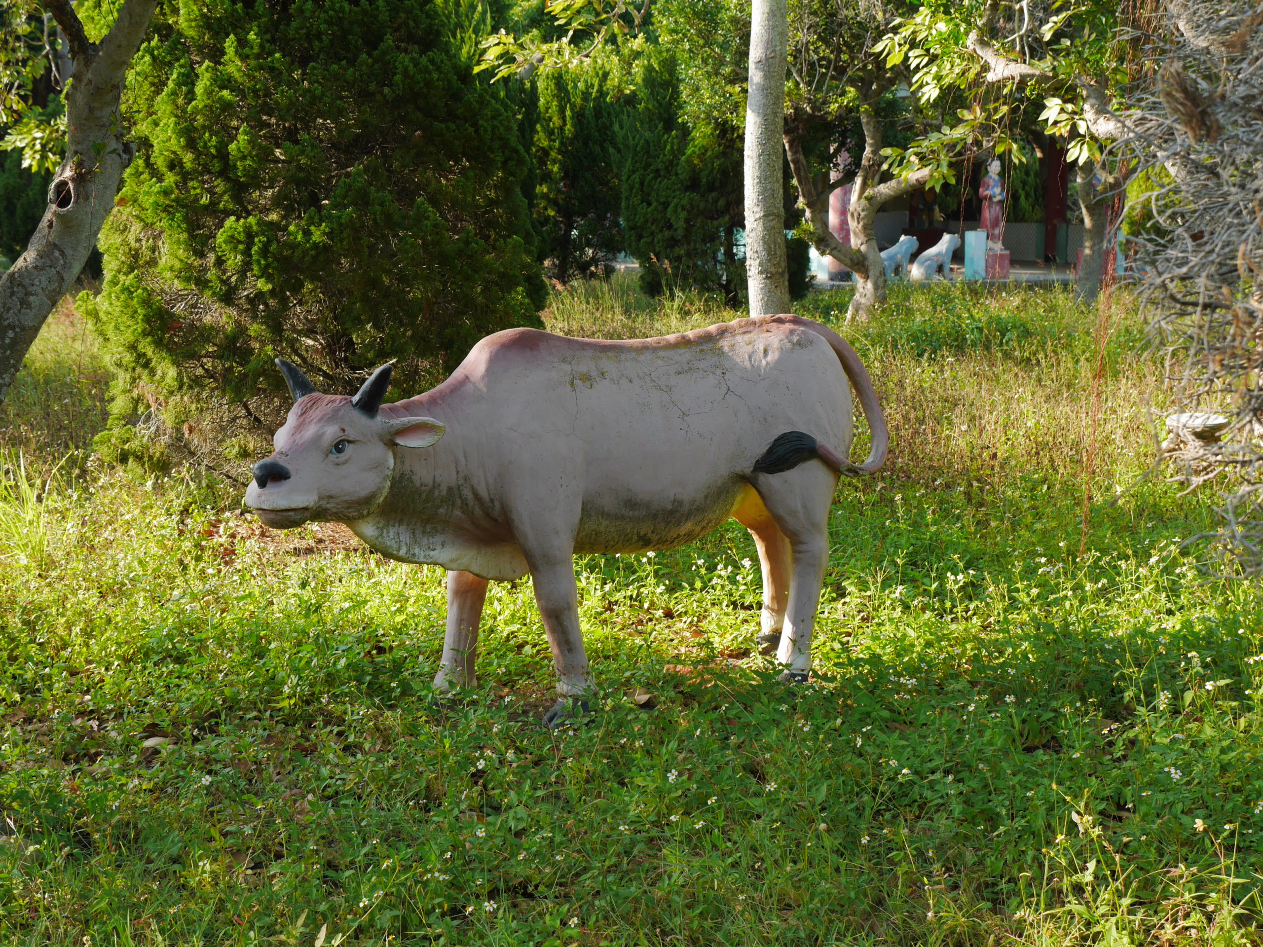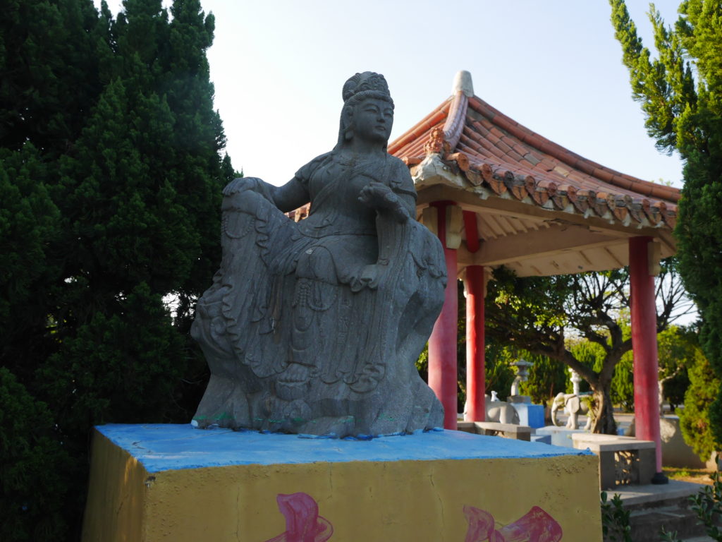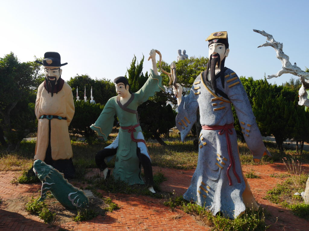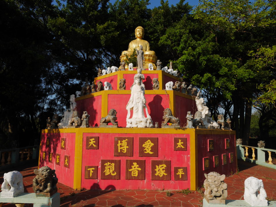 One such place is Qiumaoyuan statue park. As you can see from the map link, it is marked as a tourist spot, but you have to zoom in a fair bit in order for it to show up. There are a couple different aspects that make it really odd and, as you can guess, worth visiting for anyone with even a passing interest in such things. First is that the collection of statues it houses is so incongruous; there’s a wild mix of everything from Buddha to Jesus to animals to political propaganda and anything in between – there’s even a random cowboy for some reason. Second is the low quality of the statues. Many of them have been made with fiber glass, a material which is really not suitable Taiwan’s climate. Moreover, their design is rather sub-par, with many of the them – especially the animals – having a facial expression that makes them look either surprised and/or dumb. Third is that there are a number of temples inside the park that all have the same general size and shape, but are clearly meant for worshiping different gods; sort of “select your preferred religion”. Fourth is the fact that the place is in a state of neglect. Some parts of it are overgrown with weeds, several of the statues are cracked and broken, and there’s a general feeling about the whole place that they do just enough maintenance to keep it from falling into ruin completely. At this point I think it’s time to show some pictures so you can see for yourself.