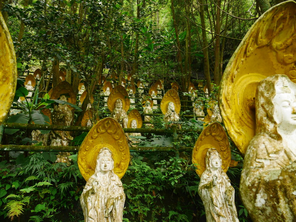 Some time ago I was hiking along the Lion Head Mountain Historic Trail when I noticed an odd shape in the jungle a couple of meters off the side of the trail. Feeling curious I stepped off the trail to investigate and found that it was a statue…actually not just one, but hundreds of statues lined up neatly next to each other in terraced rows. Once upon a time they must have been pristine white, but time and the elements have taken their toll; they’re covered in mold and grime, several of them have pieces missing, and the jungle is encroaching on the platforms where they stand, vines wrapping around their legs. What’s strange (or at least stranger than a bunch of statues in the forest) is that they are all identical depictions of the godless Guanyin; it’s as if someone copy-pasted her statue about 200 times. The only reason it’s possible to tell them apart is that they have deteriorated in slightly different ways.