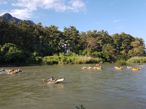 I’m floating down the river in an old tractor inner tube, it has been yellow but the paint has faded and peeled off from use and the black rubber is showing through. The water is a muddled brownish green color and the sun, already sinking lower, is sparkling on the surface like liquid silver. I lean back, raise my feet out of the water and relax. In front of me the spectacular Laotian nature, karst cliffs rising up out the jungle, and behind me the other tubers, all swimming suit clad bodies and yellow tubes, floating lazily along with me.… Read the rest